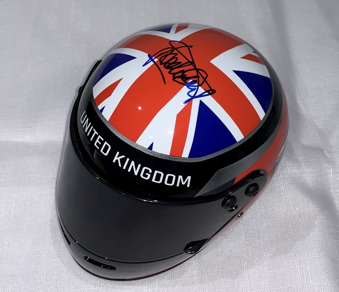 Sir Jackie Stewart signed Silverstone F1 replica helmet (1:2 scale), signed on top of the helmet on UK flag, with COA and exact photo proof