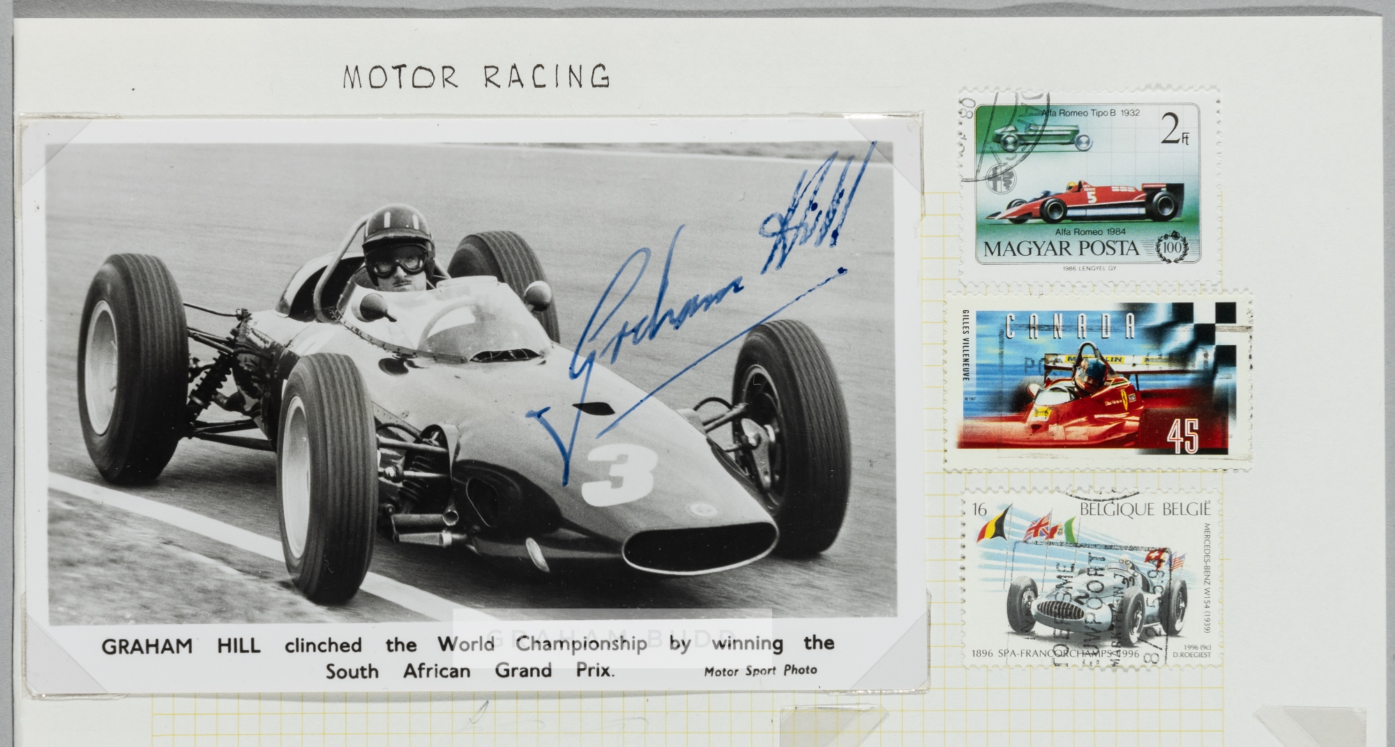 Superb signed b&w photographic card of Graham Hill winning the South African Grand Prix clinching the World championship in 1962, signed in blue pen with three F1 related franked postage stamps, all four laid on a page