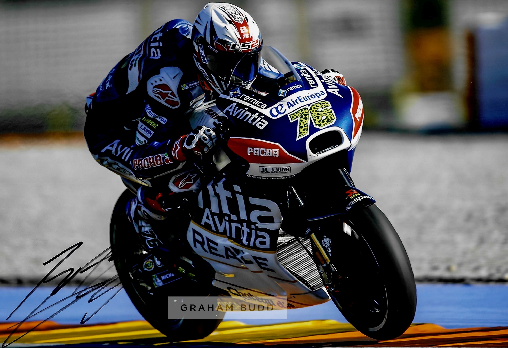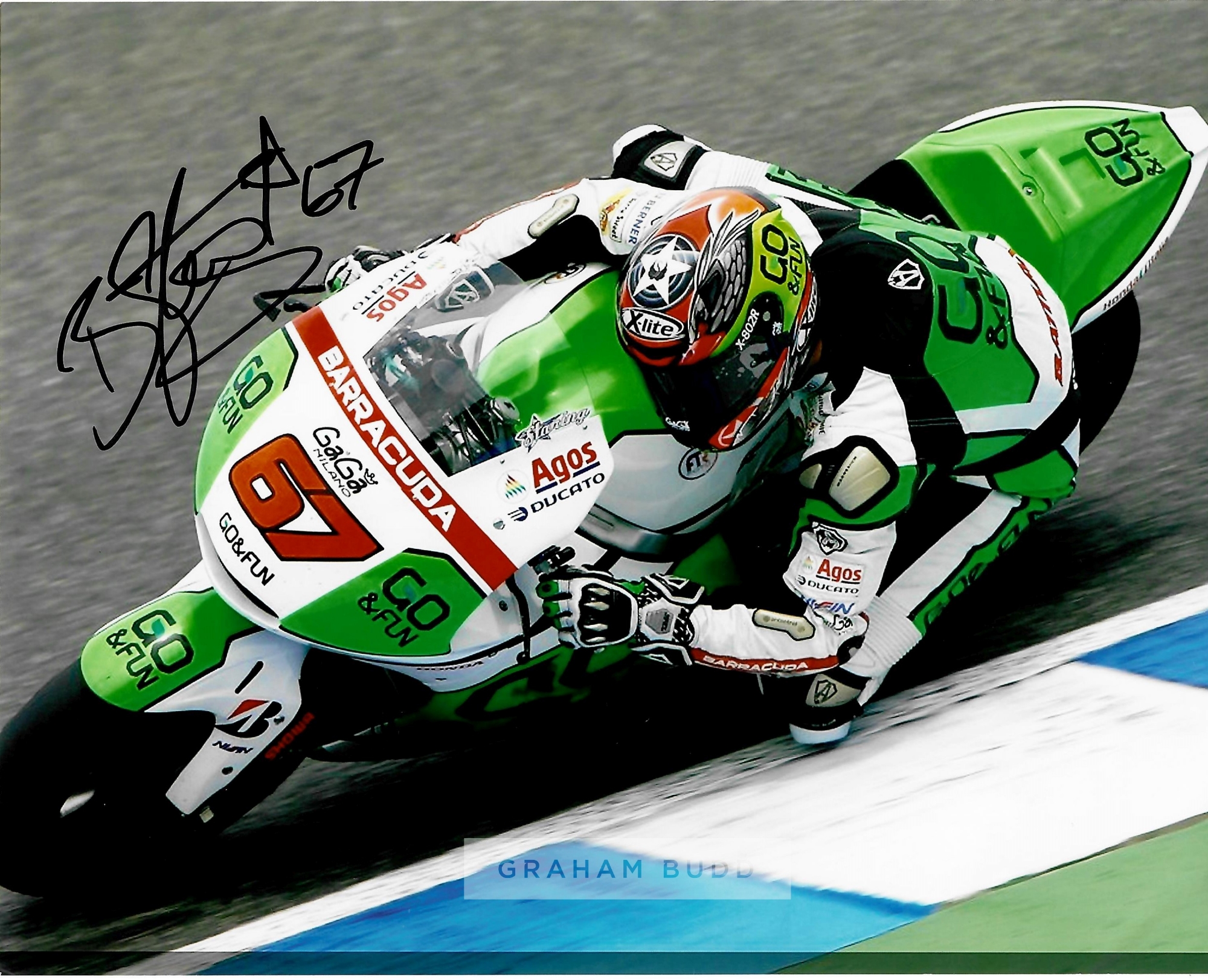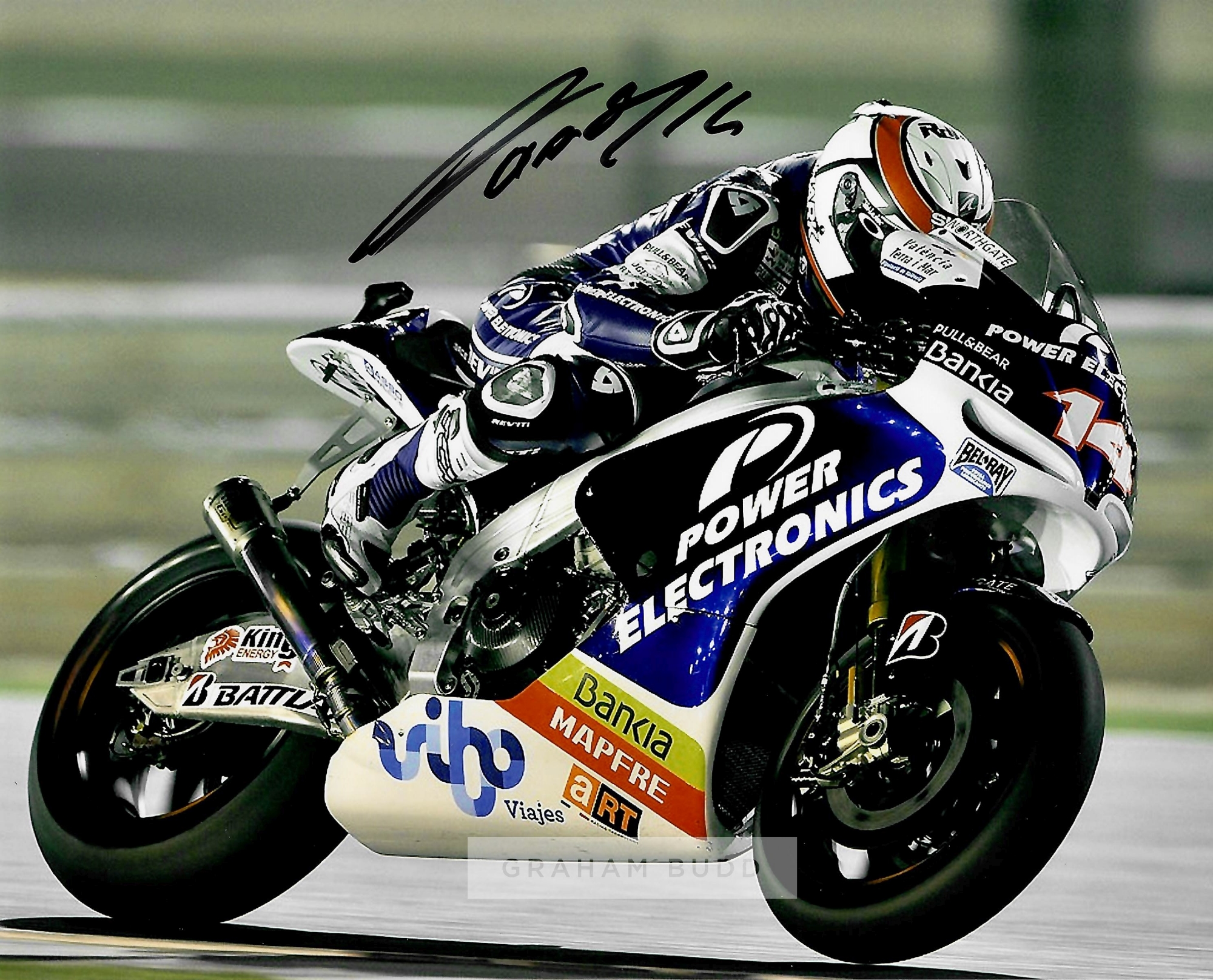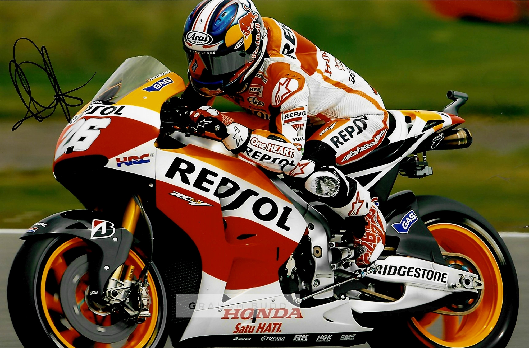 Collection of Moto GP signed photographs, including Mick Doohan no.1 (Australia), Randy de Puniet no.14 (France), Bryan Staring no.67 (Australia), all 8 by 10in., Wayne Gardner no.5 (Australia), Dani Pedrosa no.26 (Spain), Chris Vermeulen no.77 (Australia), Jorge Lorenzo no.99 (Spain), Colin Edwards no.5 (USA), Jonas Folger no.94 (Germany), Scott Redding no.45 (UK), Bradley Smith no.38 (UK), Loris Baz no.76 (France), Ben Spies no.11 (USA), Karel Abraham no.17 (Czech Republic), all 8 by 12in., includes COA and photo proof of signing, (14)