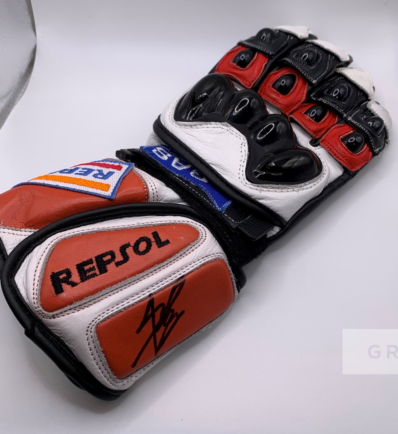 Marc Marquez (Spain) collection of signed MotoGP memorabilia, including signed 2021 Marquez trucker cap, replica Honda Repsol MotoGP glove, Alpine Star Knee slider (same brand as uses) and 8 by 10in. action photograph, includes COA and photo proof of signing, (4)