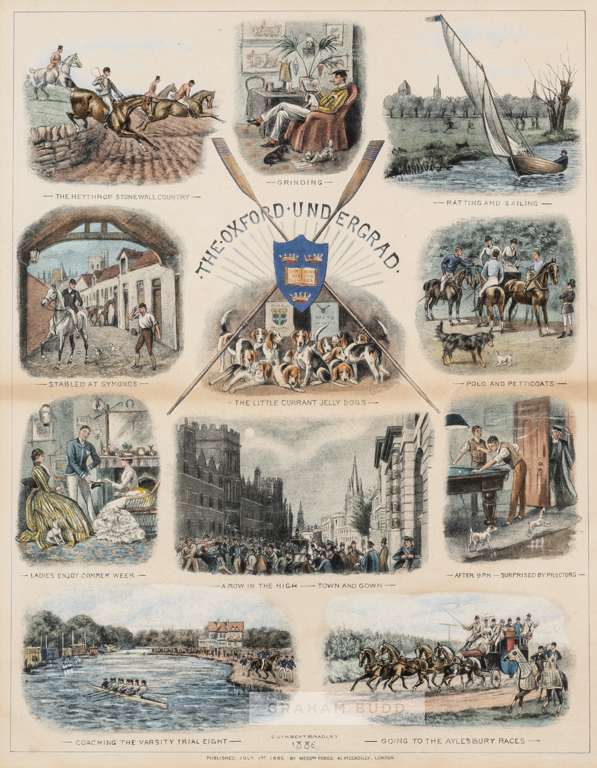 Cuthbert Bradley (British, 1861-1941) "The Oxford Undergrad" sporting lithograph, circa 1886, published by Messrs Forbes, London, coloured lithograph work depicting eleven images of the life of an Oxford undergraduate, each with a title, mounted, glazed and framed, overall 67 by 56cm. Please be aware all glass will be removed from framed and glazed items prior to posting and may result in delays to shipping your items. (This service is included in the cost of postage and packing). We can also totally remove all framing and mounts upon request to reduce shipping costs. Alternatively lots can be collected in person by prior appointment from NN8 1RT.
