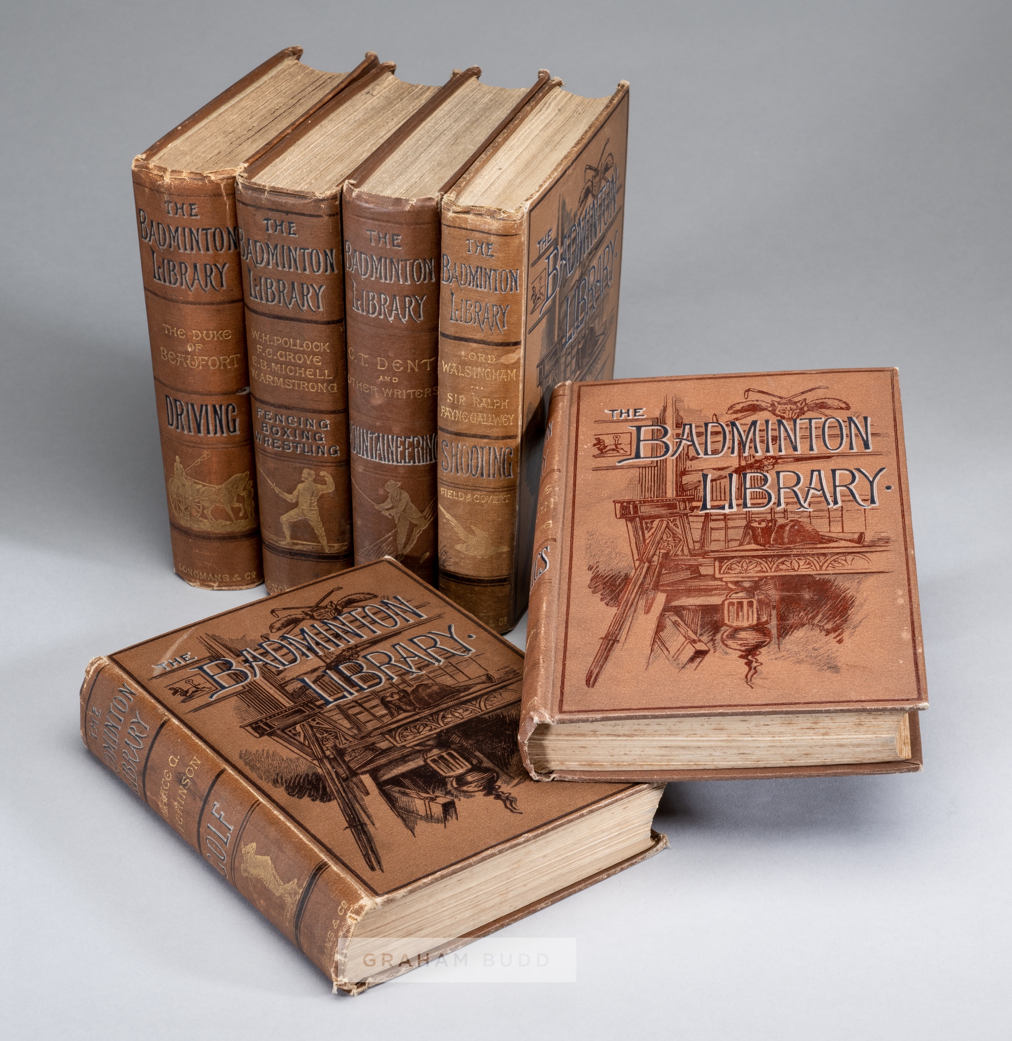 Badminton Library of Sports & Pastimes, all first editions, 32 vols., titles comprising racing & steeplechasing, yachting (2), coursing & falconry, big game shooting (2), dancing, athletics & football, motors & motor driving, boating, the poetry of sport, football, archery, riding, rowing, cricket, fishing, shooting, fishing (pike and other course fish, salmon and trout), golf, mountaineering, driving, shooting (moor and marsh), boxing & wrestling, cycling, tennis, athletics, billiards, swimming, hunting, seas fishing, skating figure staking & curling etc., generally good condition, (32)