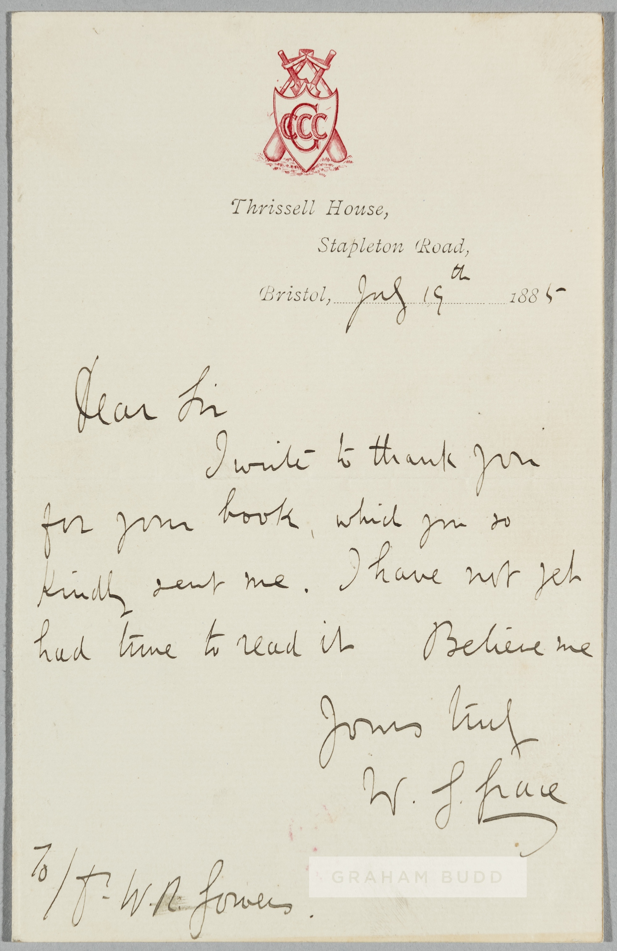 Cricketer W.G. Grace signed manuscript letter on Thrissell House letterhead, dated 19th July 1885, subject matter relates to W.G. Grace writing to thank an author for a book, written in black ink