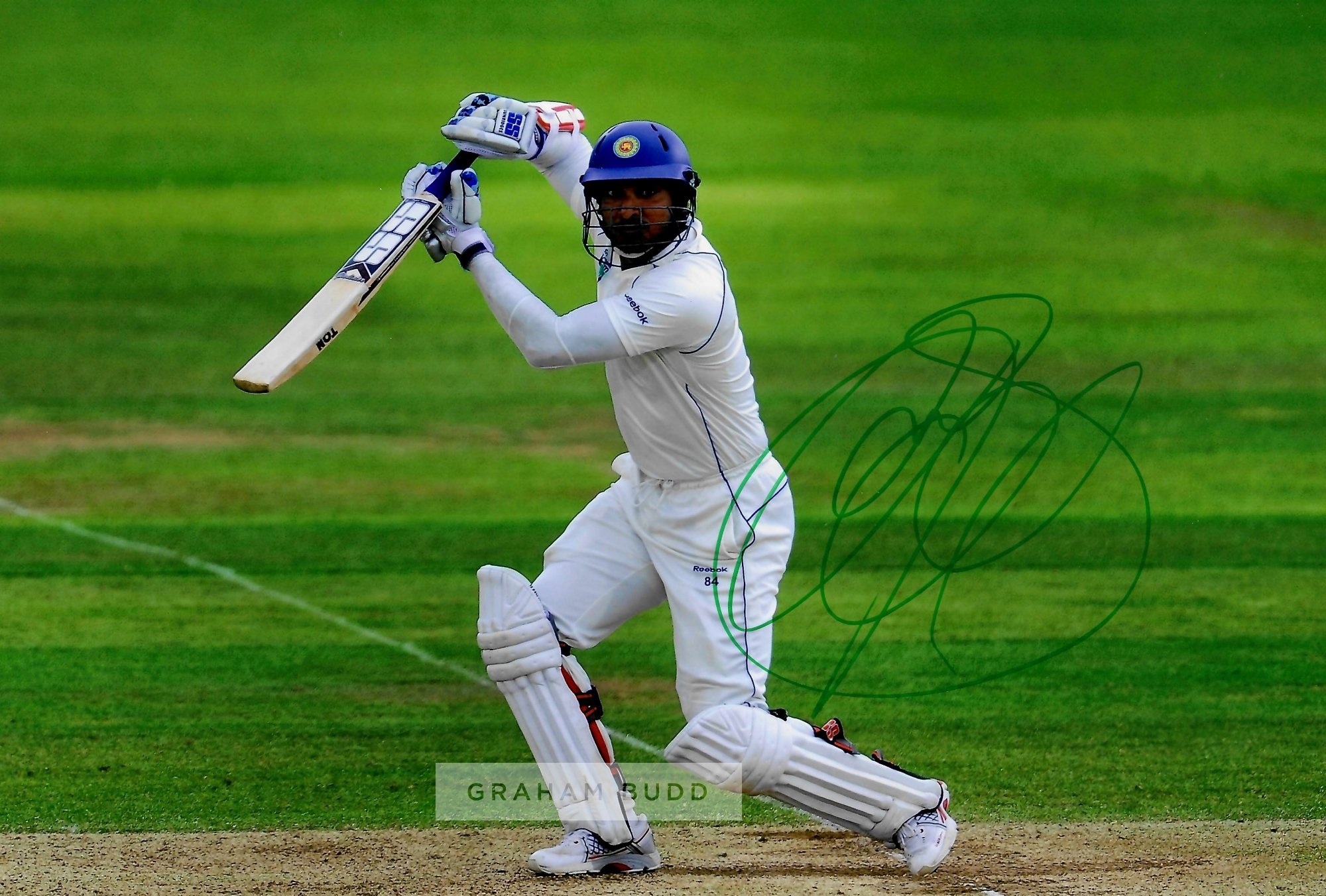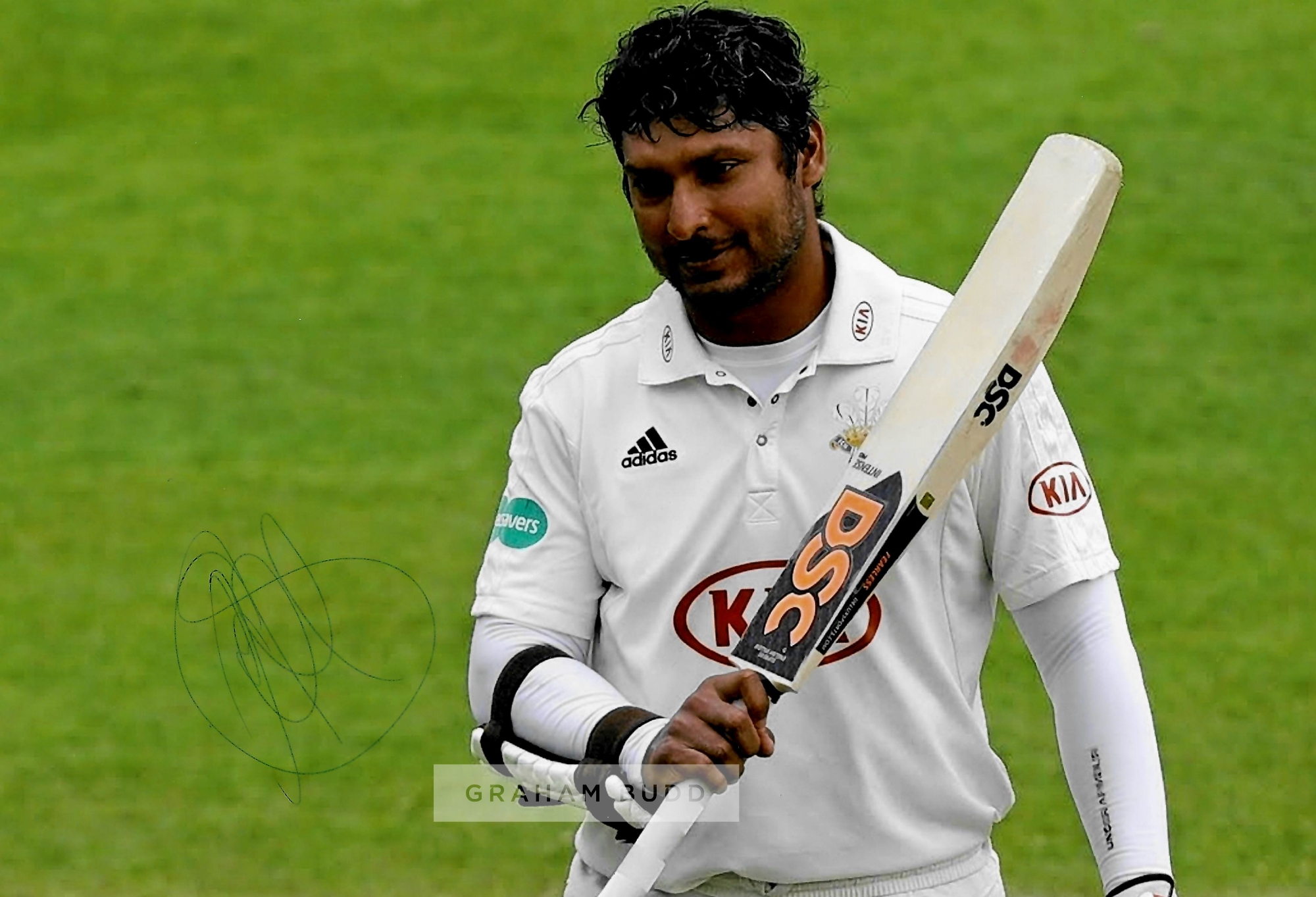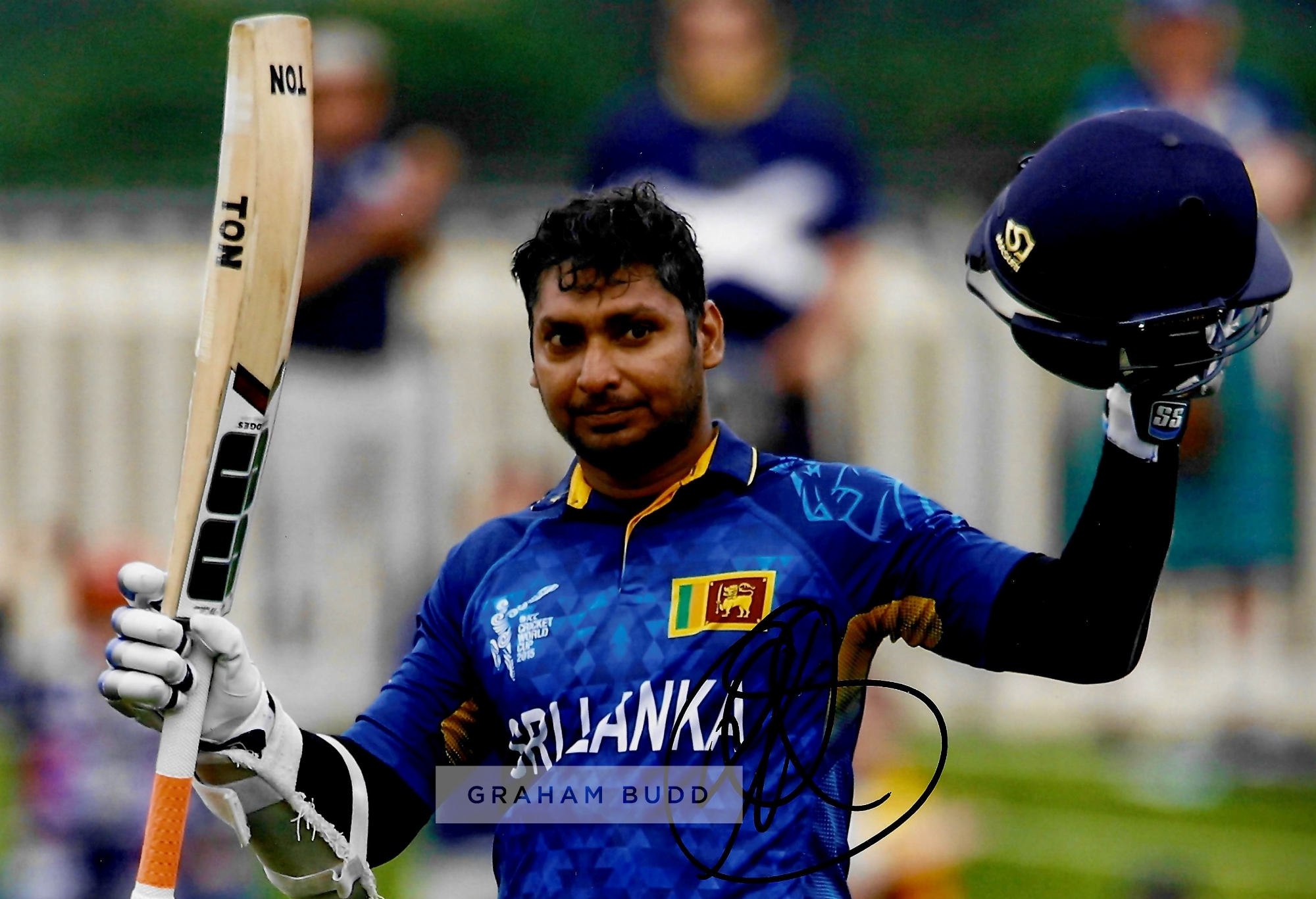 Sri Lanka cricket Kumar Sangakkara Collection, includes signed Sri Lanka limited edition cricket ball (Lords Cricket Ground), SS Ton mini bat (same brand as he used) and three 8 by 12in. action photos, one playing test match for Sri Lanka, one playing ODI match for Sri Lanka and one playing County cricket in England for Surrey CCC, includes COA and photo proof of signing, (5)