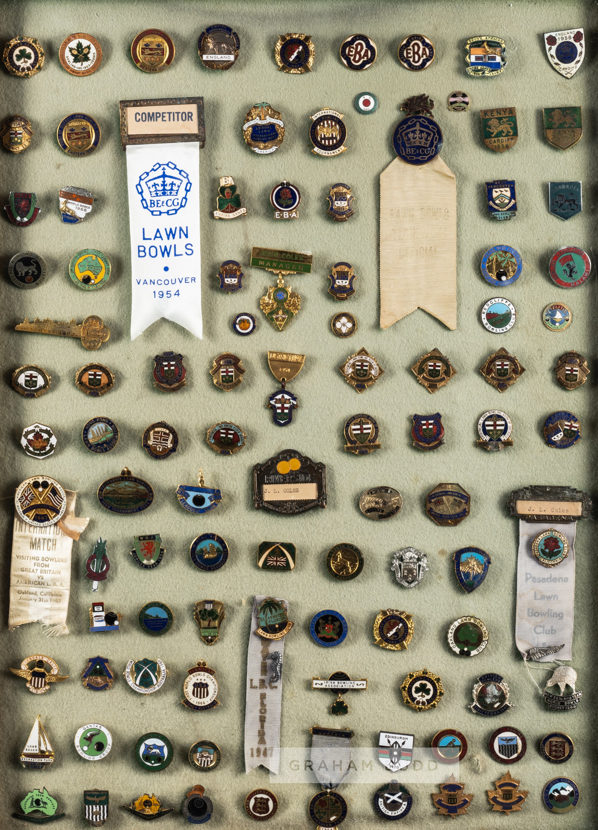 Extensive collection of bowling club badges collected by the English bowls player John Lord Coles (1892-1972) a past president of the B.C.B.A, comprising of thirteen glazed cases containing fabric and enamelled bowling club badges from around the world, one case includes 15 embroidered fabric badges for the British Bowling team Australia & New Zealand 1850-51, USA 1947, South Africa 1949-50, Canada 1954, Australia 1962-63; British Empire & Commonwealth Games badges 1954, 1958; E.B.A. badges 1947, 1953, 1958; the other cases containing large variety of gilt metal and enamelled badges, some with details printed on silk, case size 61 by 46cm., sold together with a b & w photograph of J.L. Coles wearing his E.B.A president blazer 1958, mounted and framed, overall 40 by 32cm. (13 cases and 1 framed photograph) Please be aware all glass will be removed from framed and glazed items prior to posting and may result in delays to shipping your items. (This service is included in the cost of postage and packing). We can also totally remove all framing and mounts upon request to reduce shipping costs. Alternatively lots can be collected in person by prior appointment from NN8 1RT.