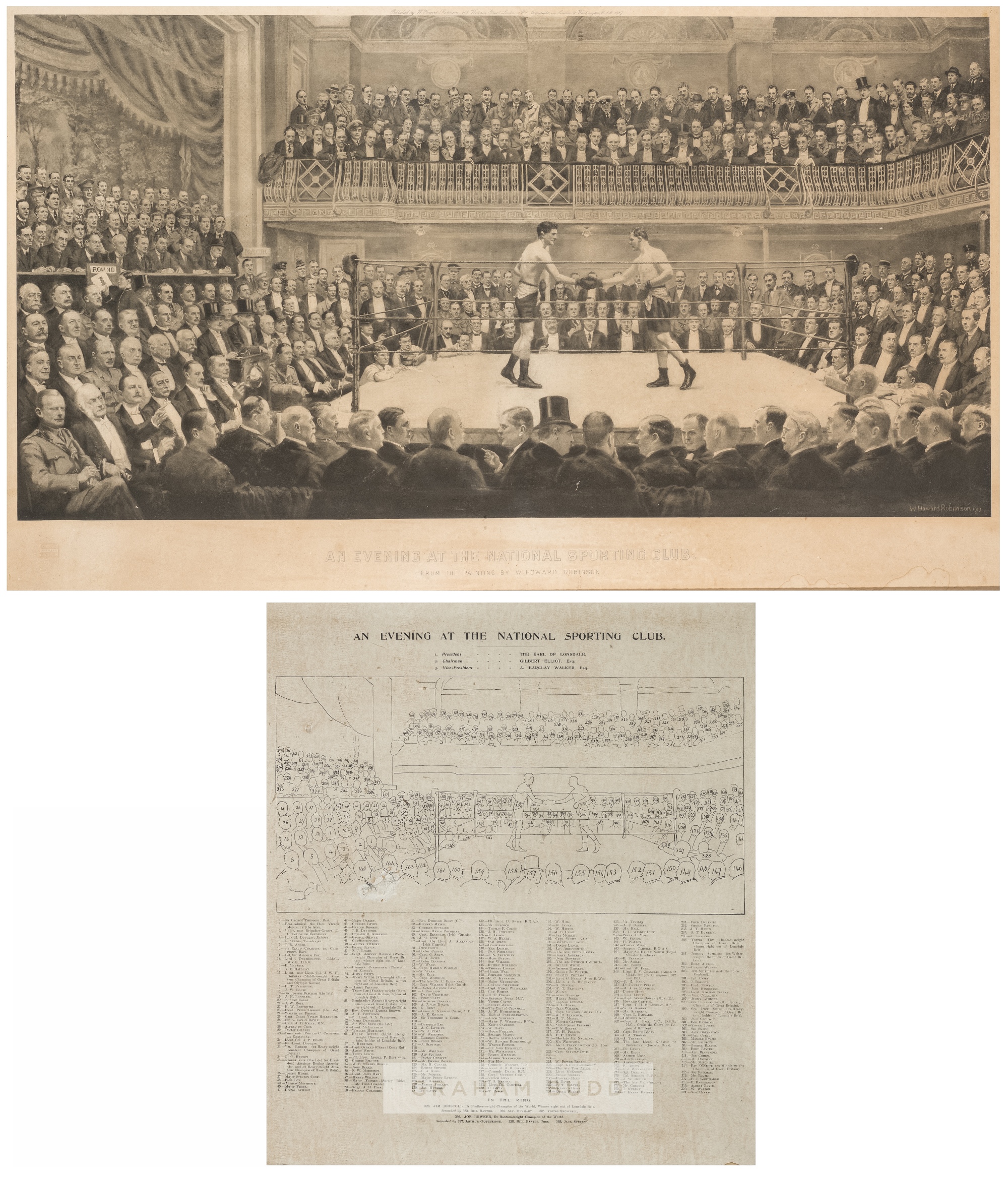 An Evening at the National Sporting Club engraving by William Howard Robinson, signed and dated 1917, depicting the 1907 British Featherweight Championship fight between Peerless Jim Driscoll and Jim Bowker in the ring before round one, with seated and standing gentlemen looking on, signed and dated in the plate, glazed and framed, overall 52 by 84cm., sold with key of illustrating the attendees by name and seated standing position, glazed and framed, overall 51 by 46cm., (2) Please be aware all glass will be removed from framed and glazed items prior to posting and may result in delays to shipping your items. (This service is included in the cost of postage and packing). We can also totally remove all framing and mounts upon request to reduce shipping costs. Alternatively lots can be collected in person by prior appointment from NN8 1RT.