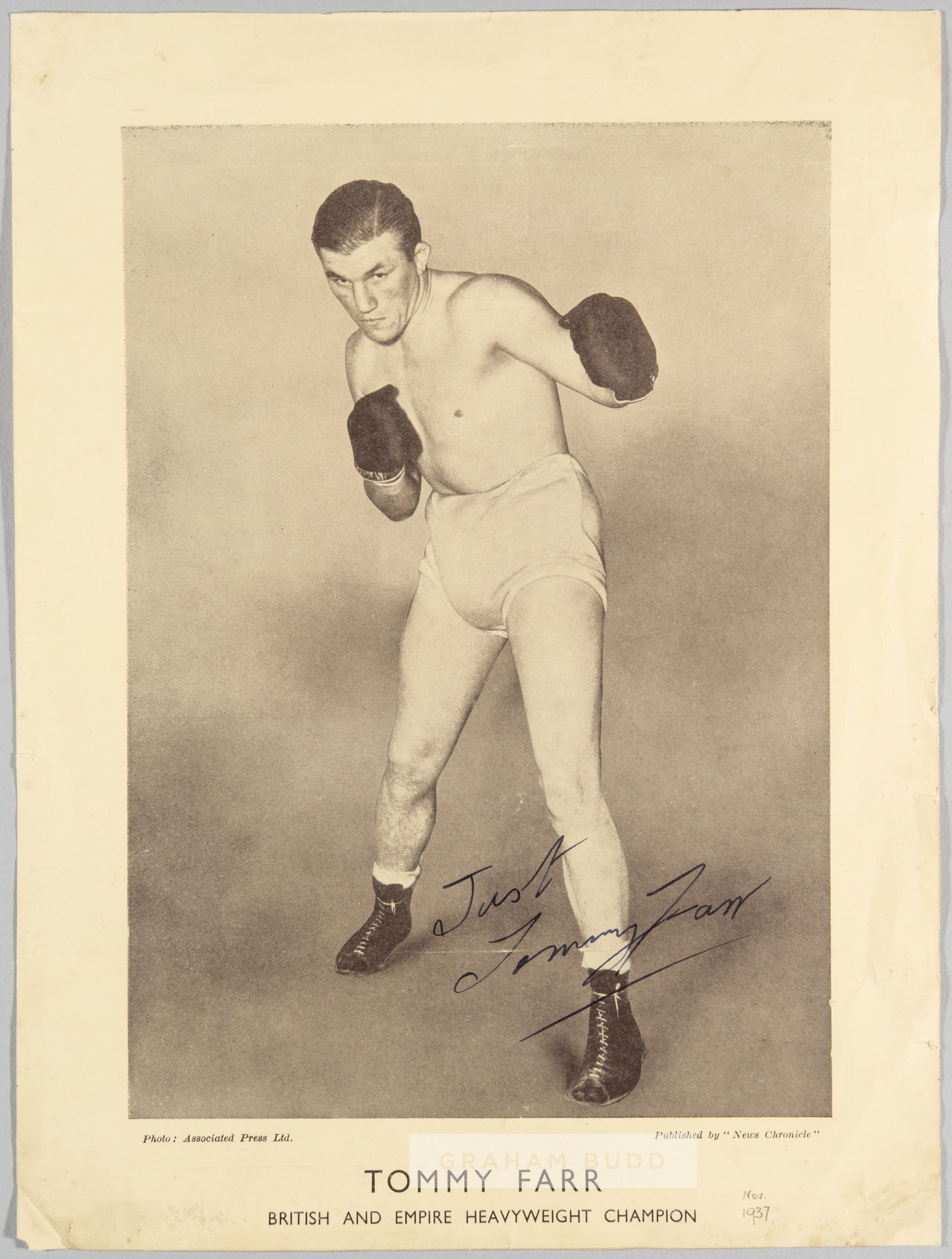 Tommy Farr 1937 British & Empire heavyweight boxing champion autographed picture, GOOD ORIGINAL SEPIA FULL PAGE (SIZE 11 ½” x 8 ½”) NEWS CHRONICLE INSERT FROM NOVEMBER 1937, DEPICTING BRITISH AND EMPIRE HEAVYWEIGHT BOXING CHAMPION TOMMY FARR IN FULL LENGTH BOXING POSE, NICELY SIGNED AND INSCRIBED IN INK TO THE LOWER RIGHT PORTION OF THE IMAGE BY TOMMY FARR. FORMERLY FROM THE COLLECTION OF EARLY 20TH CENTURY AUTOGRAPH COLLECTOR LOUIS B. FREWER, WITH NEATLY HANDWRITTEN DATE OF NOV 1937 IN PENCIL TO THE LOWER BORDER. SOME SCUFFING TO THE LOWER CORNERS AND SLIGHT TEAR TO THE LEFT-HAND BORDER (ALL FAULTS WOULD MOUNT OUT) OTHERWISE IN GOOD CONDITION Thomas George Farr (12 March 1913 – 1 March 1986) was a Welsh boxer, nicknamed "the Tonypandy Terror". Prior to 1936, Farr boxed in the light heavyweight division, in which he was the Welsh champion. He became British and Empire heavyweight champion on 15 March 1937. He challenged for the world title against Joe Louis in the same year and gave Louis one of the toughest fights of his career, hurting him numerous times and lasting the full 15 rounds on his way to a wide unanimous decision loss, with the referee awarding Louis the fight thirteen rounds to one, while the judges scored the fight eight to five and nine to six, both in Louis's favour. The decision was booed by spectators. Farr is considered to be one of the greatest British heavyweight fighters ever. Farr was inducted into the Welsh Sports Hall of Fame in 1997.