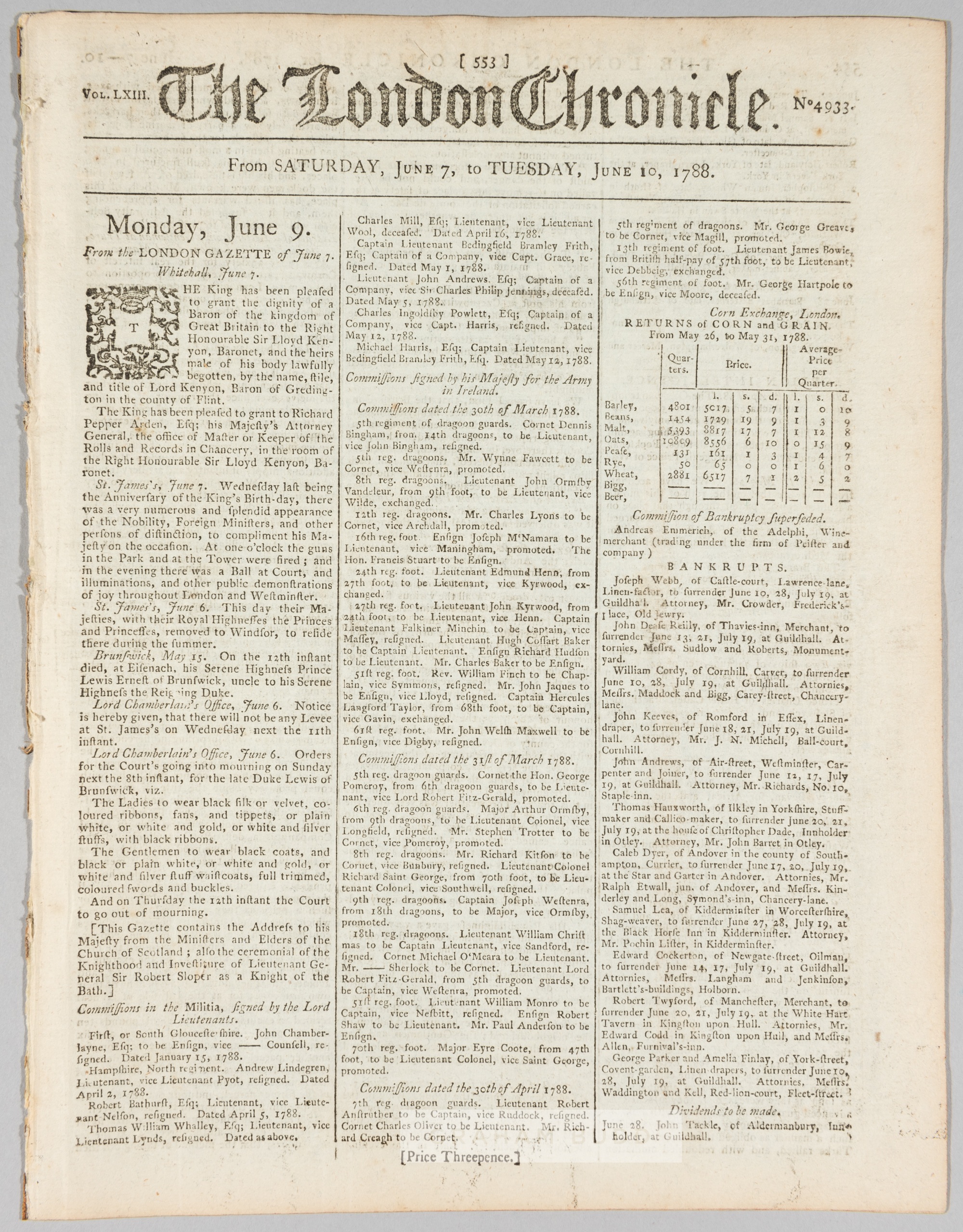 The London Chronicle with cricket and sailing reports, dated Saturday June 7th to Tuesday June 10th 1788, eight-page, Vol.LXIII, No.4933, three-colum