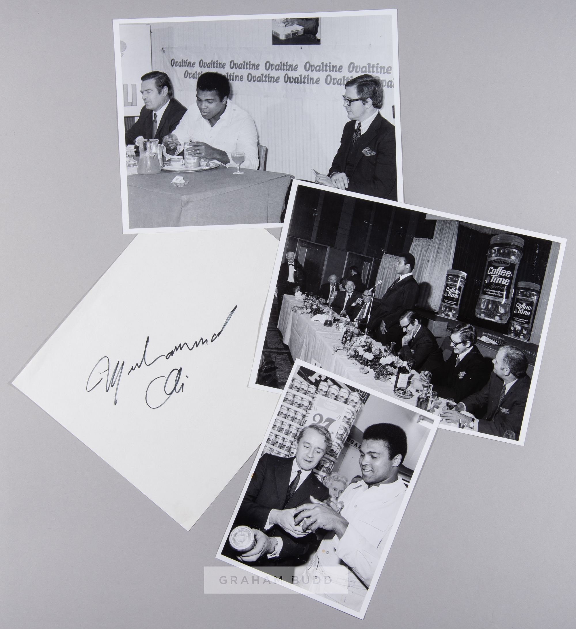 BOXING - Muhammad Ali autograph, excellent large flowing example from 12th October 1971; sold with three original photographs from the Ovaltine tour (4)