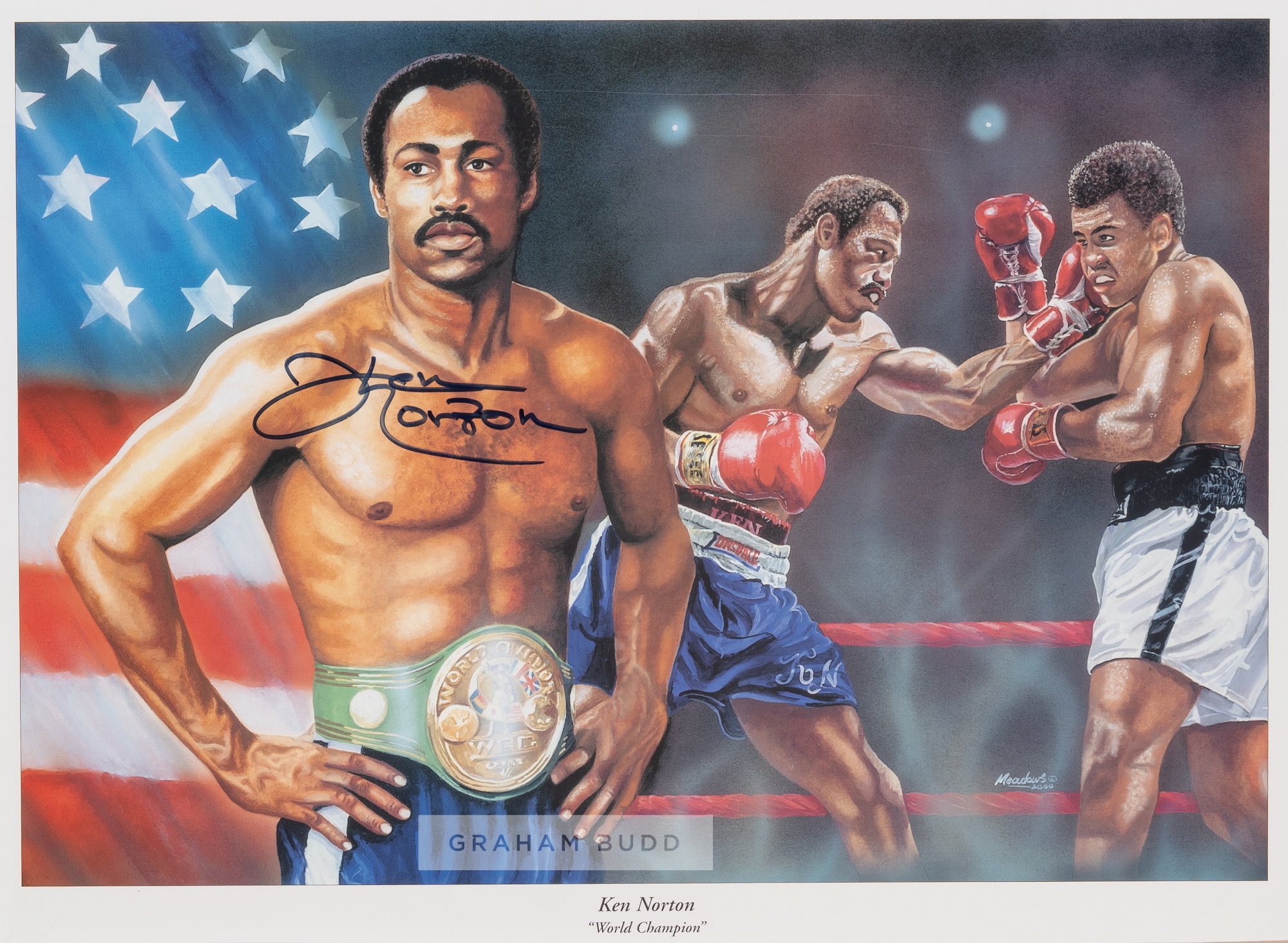 BOXING - Ken Norton signed boxing print, the artwork by Meadows and dated 2000, depicting Norton in action v Ali, and a portrait of Norton wearing his World Championship belt, signed in black marker, the image 34.5 by 50cm., mounted ready for framing, 50 by 70cm. overall