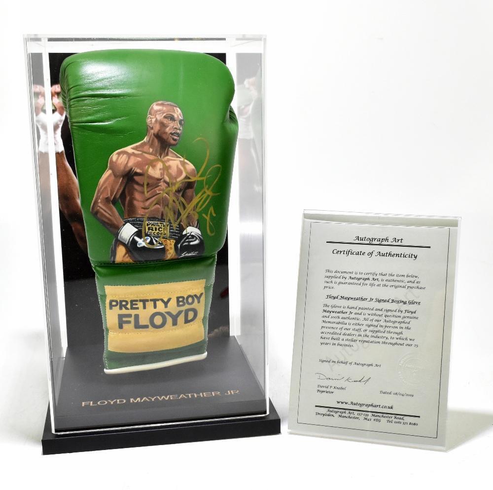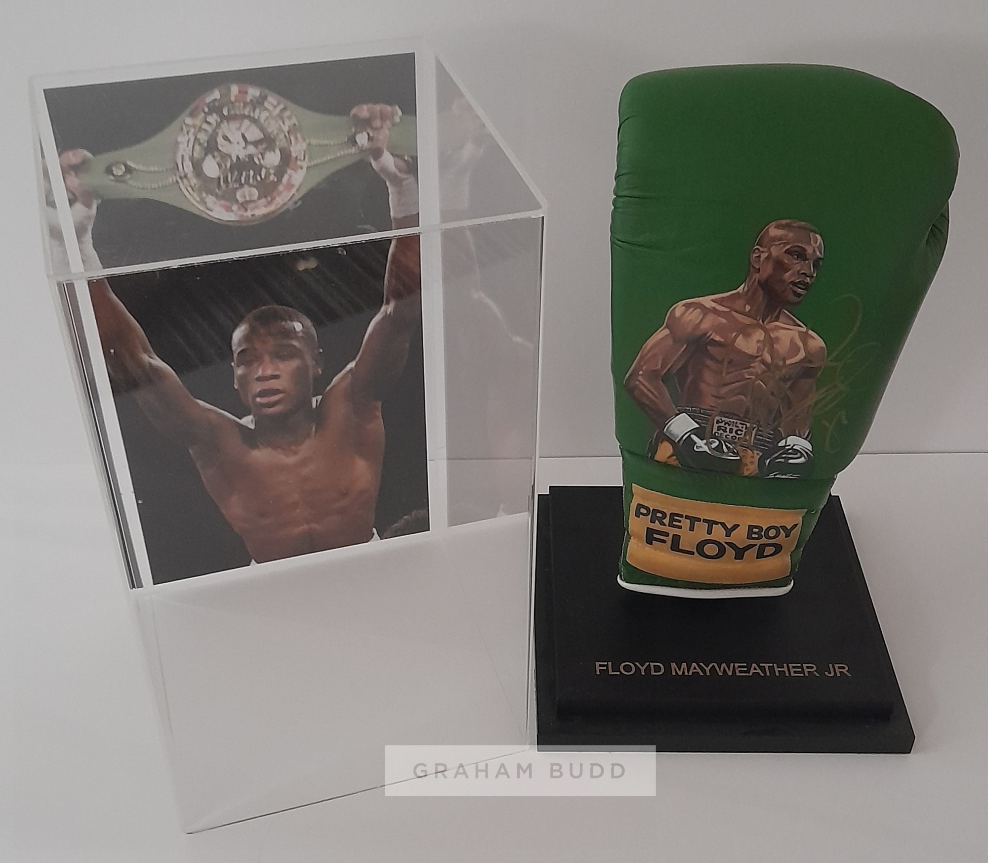 Floyd Mayweather jnr signed 16oz painted boxing glove, mounted within perspex display case that measures 26 by 21 by 21cm, comes complete with COA