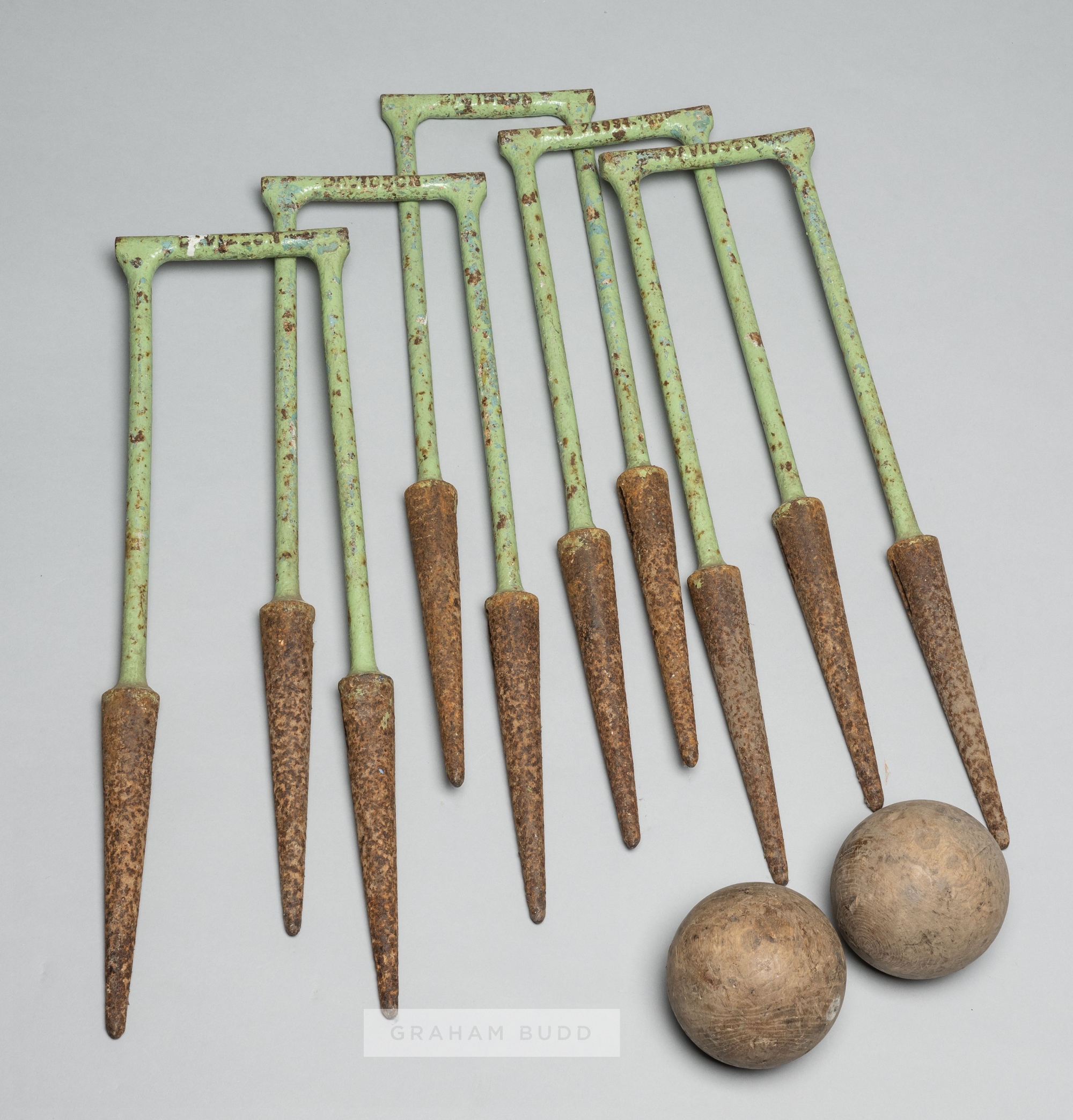 Five cast iron croquet hoops by Davidson, circa 1898, marked Pat no.26994; sold with two old croquet balls, (7)