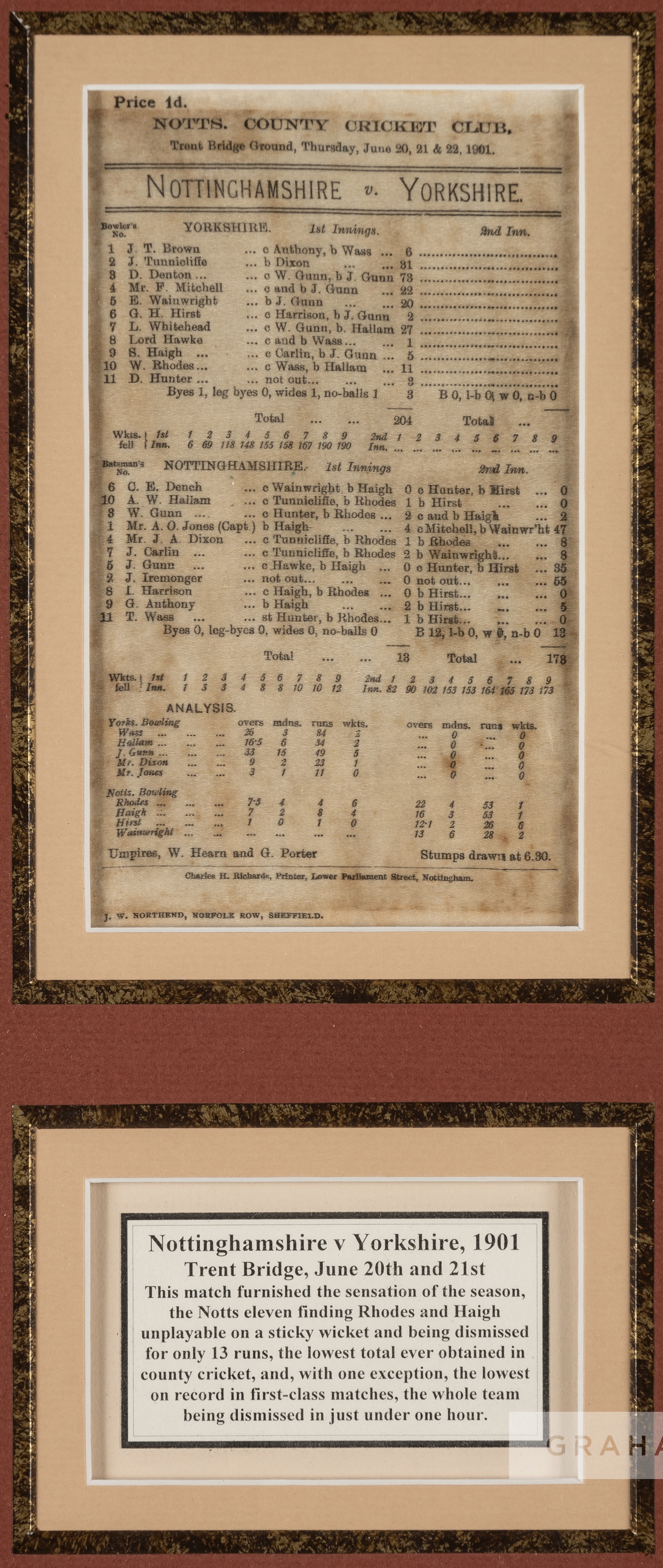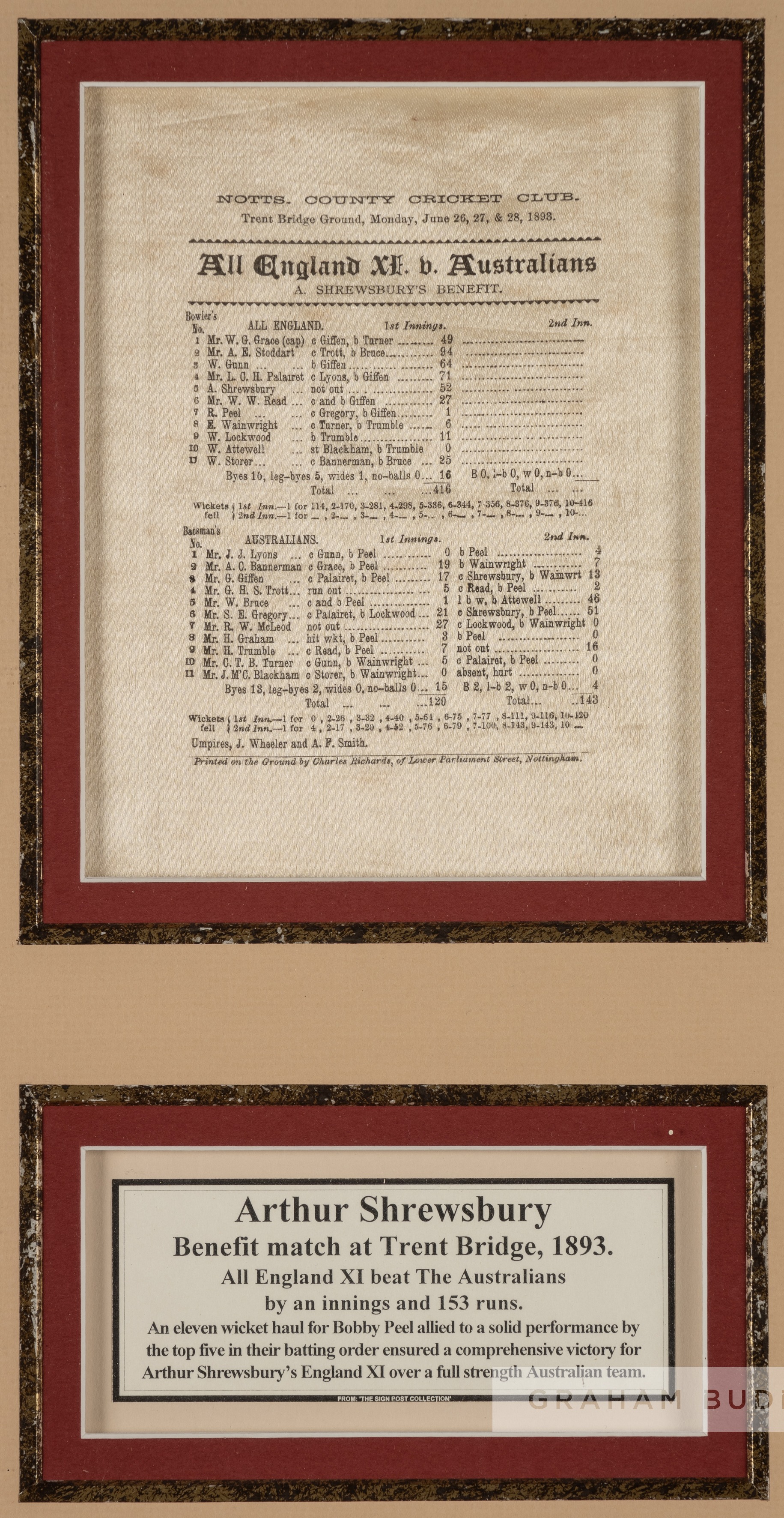 Three silk commemorative cricket scorecards for matches played at Lord's and at Trent Bridge, dating between 1886 and 1901, comprising Australians v Eleven of England scorecard at Lord's Ground, 13th - 15th September 1886, printed on silk, mounted, glazed and framed, overall size43 by 6cm.; Arthur Shrewsbury benefit match All England XI v Australians scorecard at Notts. County Cricket Club, 26th - 28th 1893, printed on silk above a typed legend, mounted, glazed and framed, overall size 52 by 35cm; Nottinghamshire v Yorkshire scorecard at Notts. County Cricket Club, 20th - 22nd June 1901, printed on silk, above typed legend, mounted, glazed and framed, overall size50 by 30cm., slight foxing to third silk, (3) Arthur Shrewsbury's England team defeated Australia by an innings and 153 runs. W.G Grace opened the batting with Stoddart and put on 114 for the first wicket. Stoddart made 94, Grace 49, Gunn 64, Palairet 71, Shrewsbury 52 not out. Peel took eleven wickets in the match, Gregory made 51 in the Australians 2nd innings. Provenance: Australians v Eleven of England, Christies auction London, 23rd November 2004. Please be aware all glass will be removed from framed and glazed items prior to posting and may result in delays to shipping your items. (This service is included in the cost of postage and packing). We can also totally remove all framing and mounts upon request to reduce shipping costs. Alternatively lots can be collected in person by prior appointment from NN8 1RT.