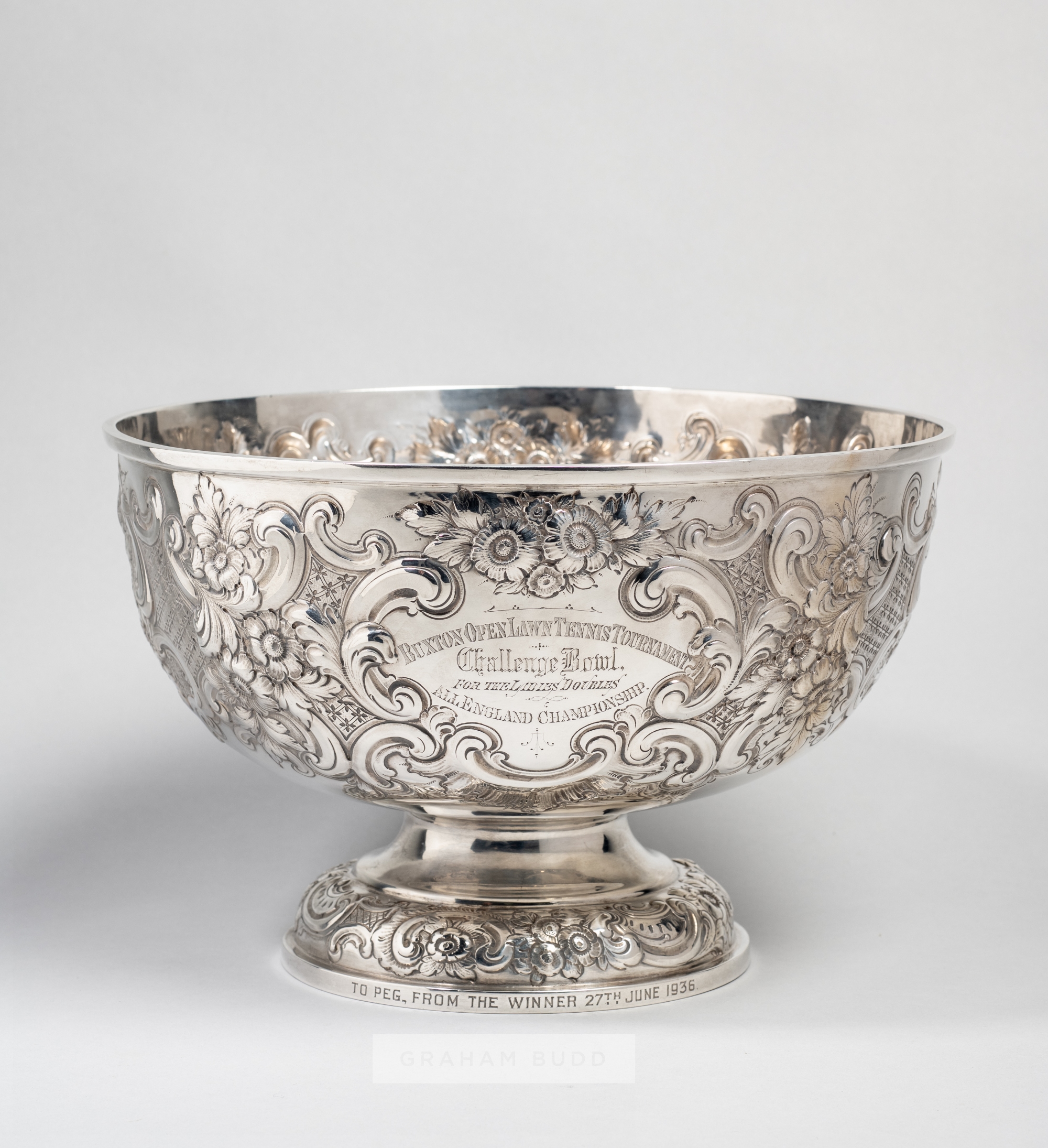 An important early trophy for women's tennis: The Buxton Open Lawn Tennis Tournament Challenge Silver Bowl for the Ladies Doubles All England Championship competed for between 1896 and 1902, the large rose bowl embossed the acanthus scrolls, rose heads and hatched decoration surrounding two engraved cartouches bearing BUXTON OPEN LAWN TENNIS TOURNATMENT CHALLENGE BOWL FOR THE LADIES DOUBLES ALL ENGLAND CHAMPIONSHIP and the second with the winners names dating from 1896 to 1902 including three time winners Mrs Pickering and Miss Robb, raised upon a waited circular pedestal base with similar embossed decoration, the base engraved TO PEG FROM THE WINNER 27TH JUNE 1936, hallmarked London 1896 by Wakely and Wheeler, diameter 28cm., height 18cm., weight approx. 1164gm. Prior to 1913 Ladies’ Doubles was a non -Championship Event at Wimbledon and the Ladies Doubles All England Championship was held in the quiet English Spa town of Buxton in the Peak District. The first winners in 1887 were Lottie Dod and May Langrishe. In 1893, 1894 & 1895 the tournament was won by Mrs Hillyard and Mrs Steedman, and upon the third victory the trophy was retired and the players were allowed to retain it. What is being sold here is the new trophy first competed for in 1896. This trophy too was to be retired after the 1902 competition when Mrs Pickering and Miss Robb won it for a third time. The engraving to the base informs us that the trophy was later presented to "Peg" on 27th June 1936. Provenance: Mellors & Kirk auction, September 2019, Lot 173.
