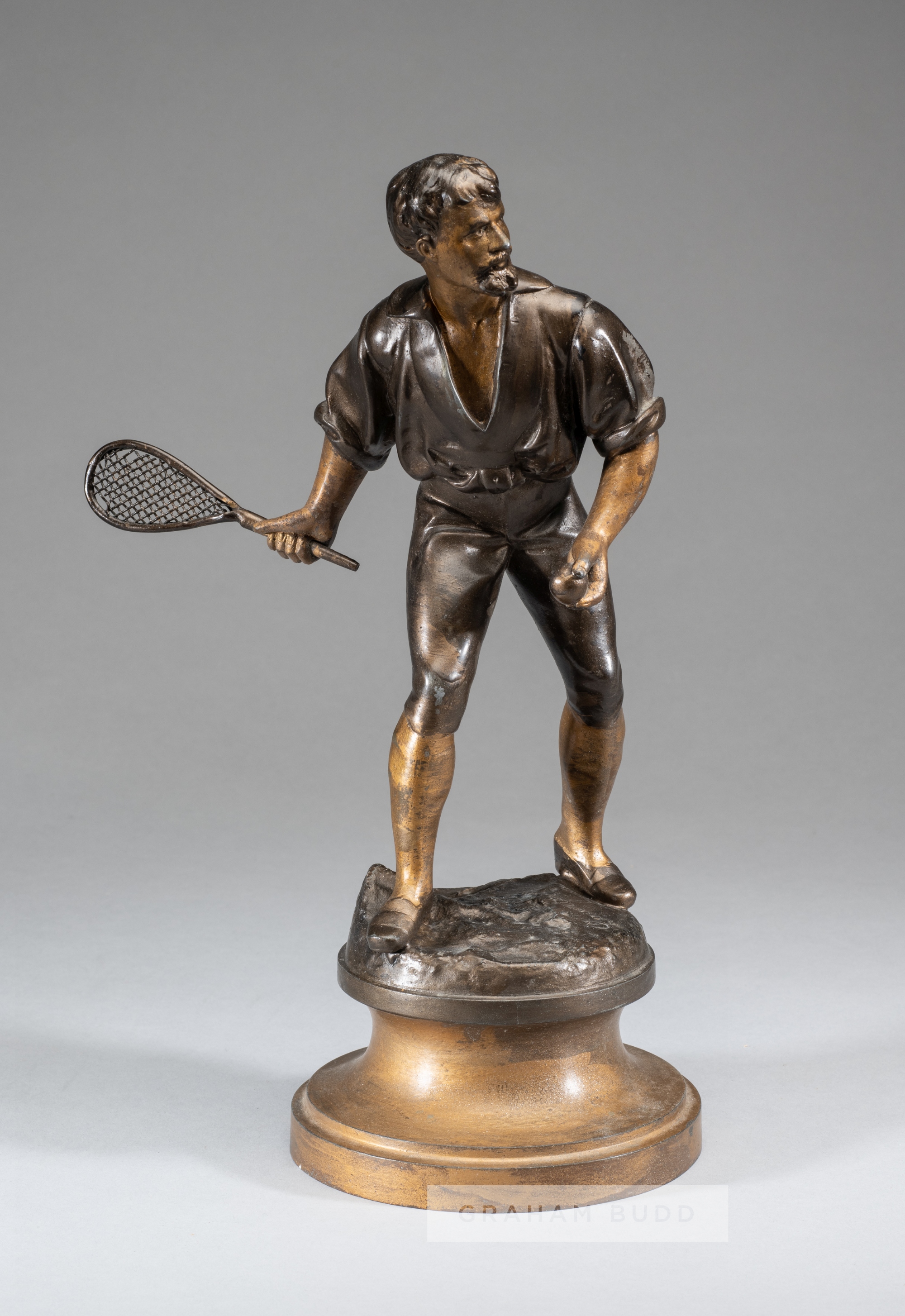 French spelter figure of a real tennis player by Adolphe Jean Lavergne (1863-1928), with bronze and gilt-bronze patina, signed, 33 by 20cm.
