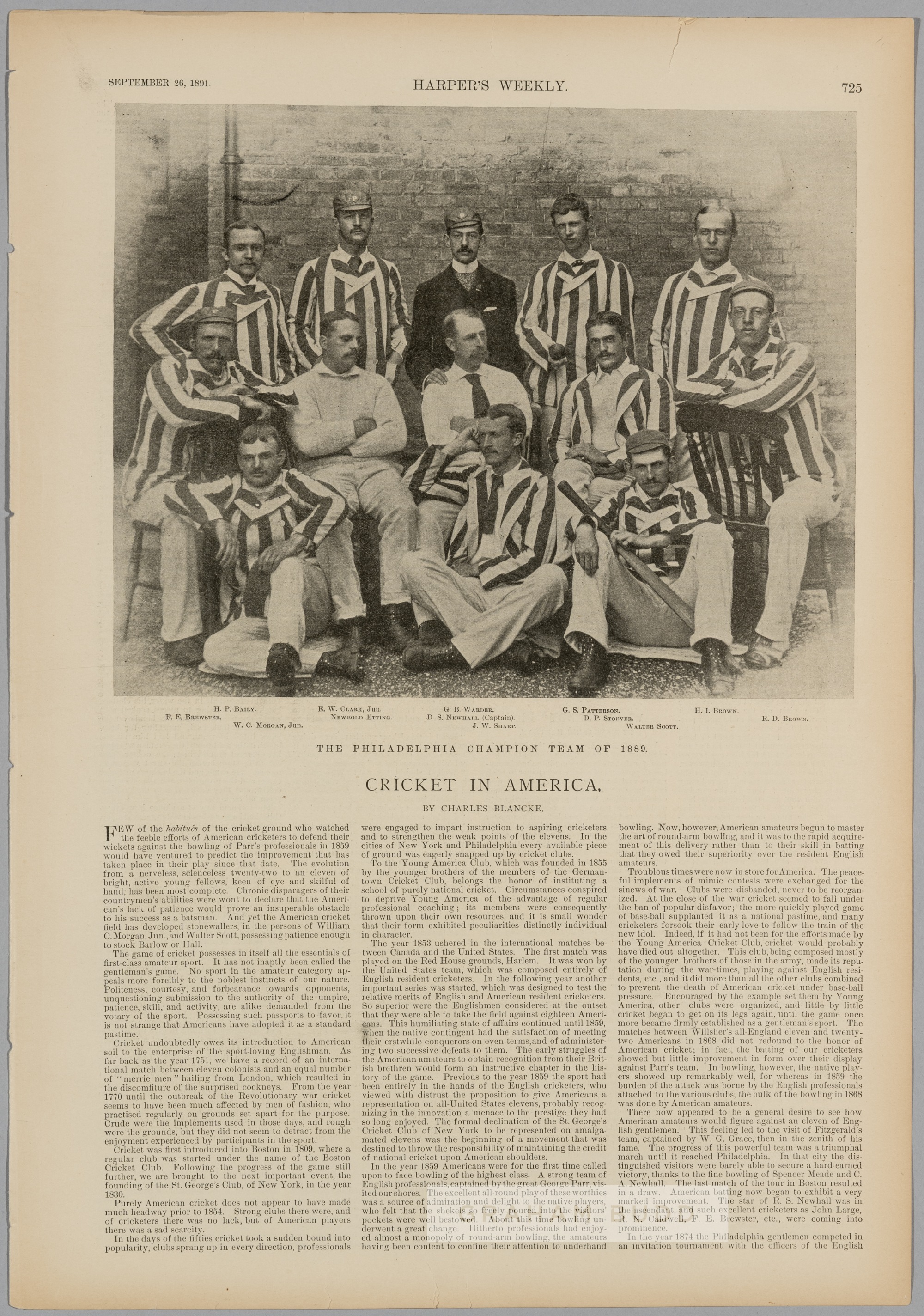 Extract from an 1891 Harper's Weekly magazine featuring a full page illustrated article on Cricket in America, Vol XXXV No.1814, dated 26th September 1891, the article authored by Charles Blancke, printed on pages 725, 726 & 732, featuring a photographic plate of the Philadelphia Champion Team of 1889, and portrait images of J.E. Schwartz, Spencer Meade, W. Brockie Jun., Dr. J. Allison Scott and John B. Thayer Jun.