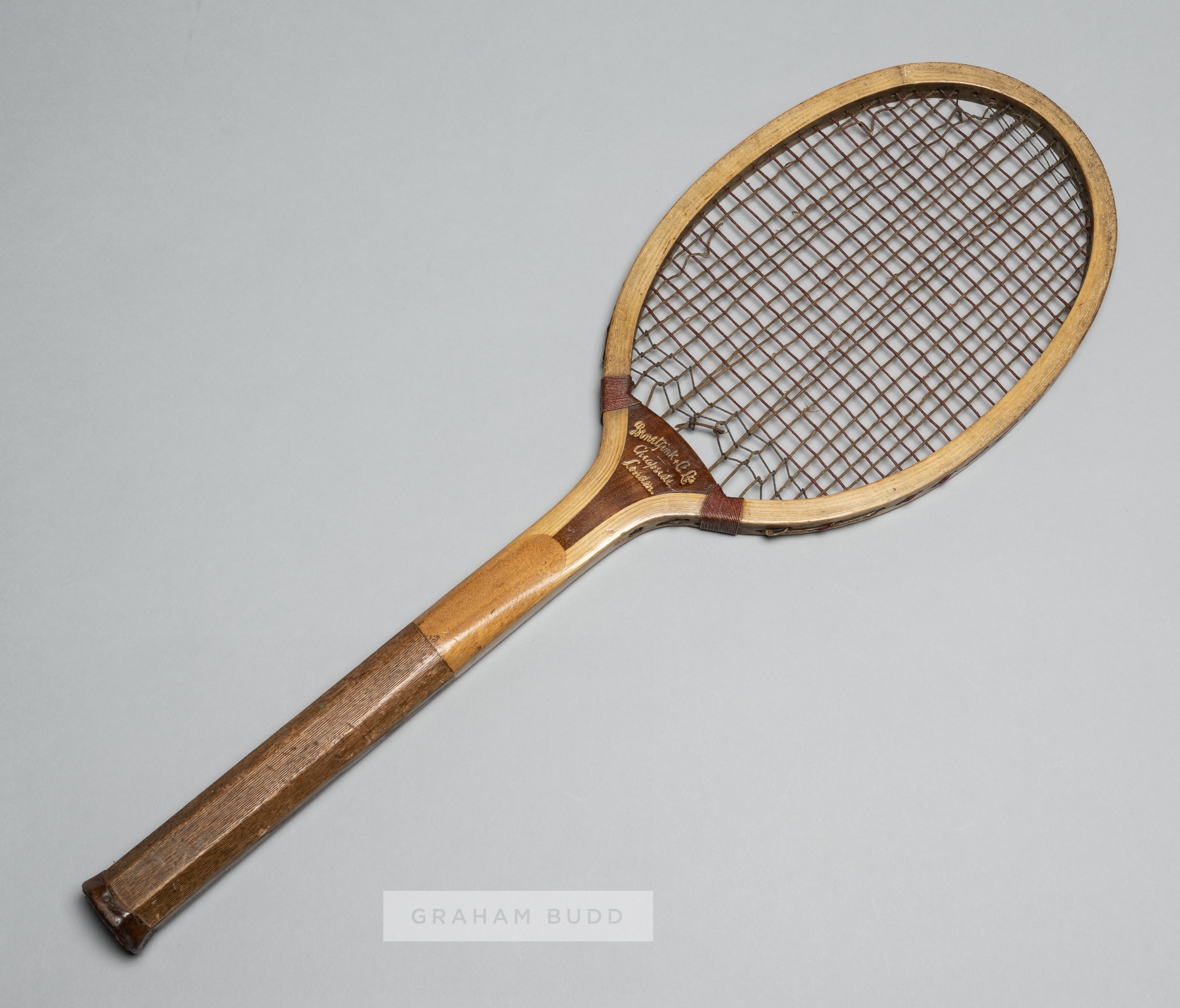 An "AWG" [Arthur William Gore] lawn tennis racquet by Benetfink & Co. Ltd of Cheapside, London, circa 1905, the frame is in excellent condition and t