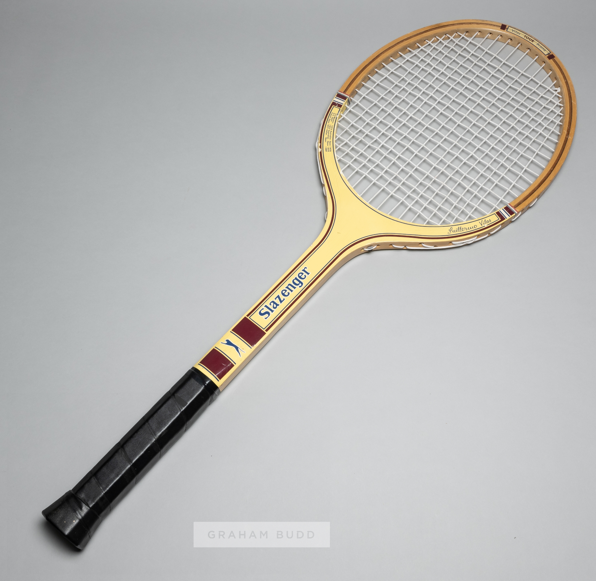 A large, oversize Slazenger's shop display tennis racquet "Guillermo Vilas", listing his major victories, US Masters 1974, US Open 1977, French Open 1977, Australian Open 1978 and 1979 and Italian Open 1980, excellent condition