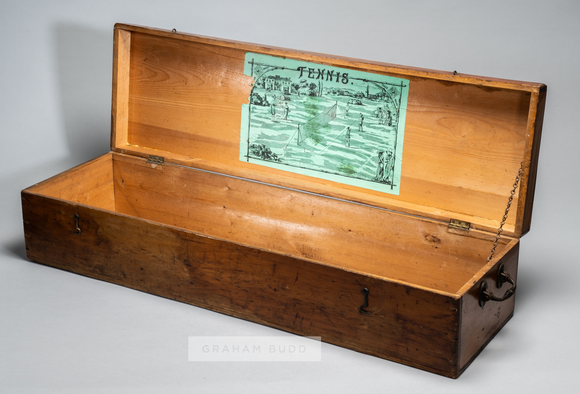 Early lawn tennis set pine box, circa 1879, with green litho on the underside of the hinged lid, bearing a Maltese cross trademark of F.H. Ayres of L