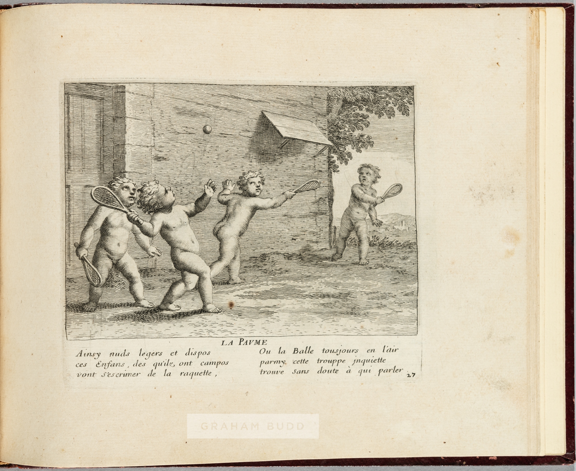 A French 17th century book by Jacques Stella titled ‘Les Jeux et Plaisris de l'Enfance’ (The Games and Pleasures of Childhood) with 50 delightful engravings depicting putti engaged in childhood pursuits and sports including Jeu de Paume, shuttlecock, ball games, fencing etc., Published in Paris in 1657 by Aux Galleries du Louvre chez la ditte Stella, oblong, burgundy morocco gilt (modern binding), engraved title page, a plate of Coats of Arms, a printed sheet bearing the dedication to the children of Jacques-Auguste de Thou and 50 beautiful plates followed by a six, all on double page and mounted on tabs, first printing, engravings by Claudine Bouzonnet Stella after drawings by Jacques Stella