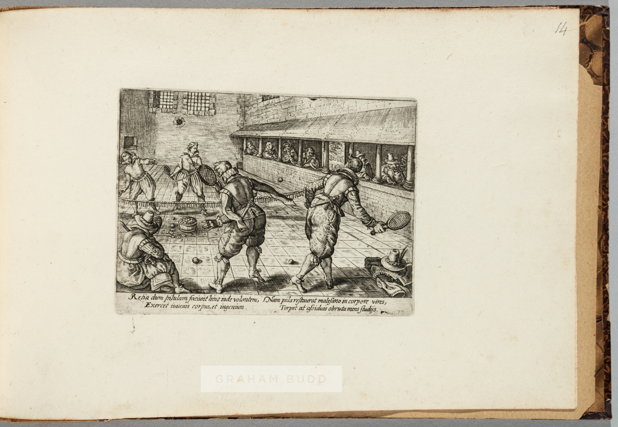 A Dutch 17th century book by Crispijn de Passe titled ‘Academia sive speculum vitae scholasticae’ containing a beautiful and early engraving of Real Tennis, Published in Arnhem, Johannes Janssonius, 1612, oblong 4to., complete suite composed of an engraved and illustrated title, a dedication sheet, and 16 engraved plates with legend printed opposite, rare volume with plates illustrating the life of students at the beginning of the 17th century, the legend of the tennis engraving translates: “As the racquets send the small balls flying back and forth,/The young keep their bodies and minds constantly engaged./For the ball restores the strength in the weakened body,/But rests the mind overwhelmed by ceasless study", as well as tennis, subjects including fencing, the library, graduation, dance, music, painting, womanising etc., in a modern binding