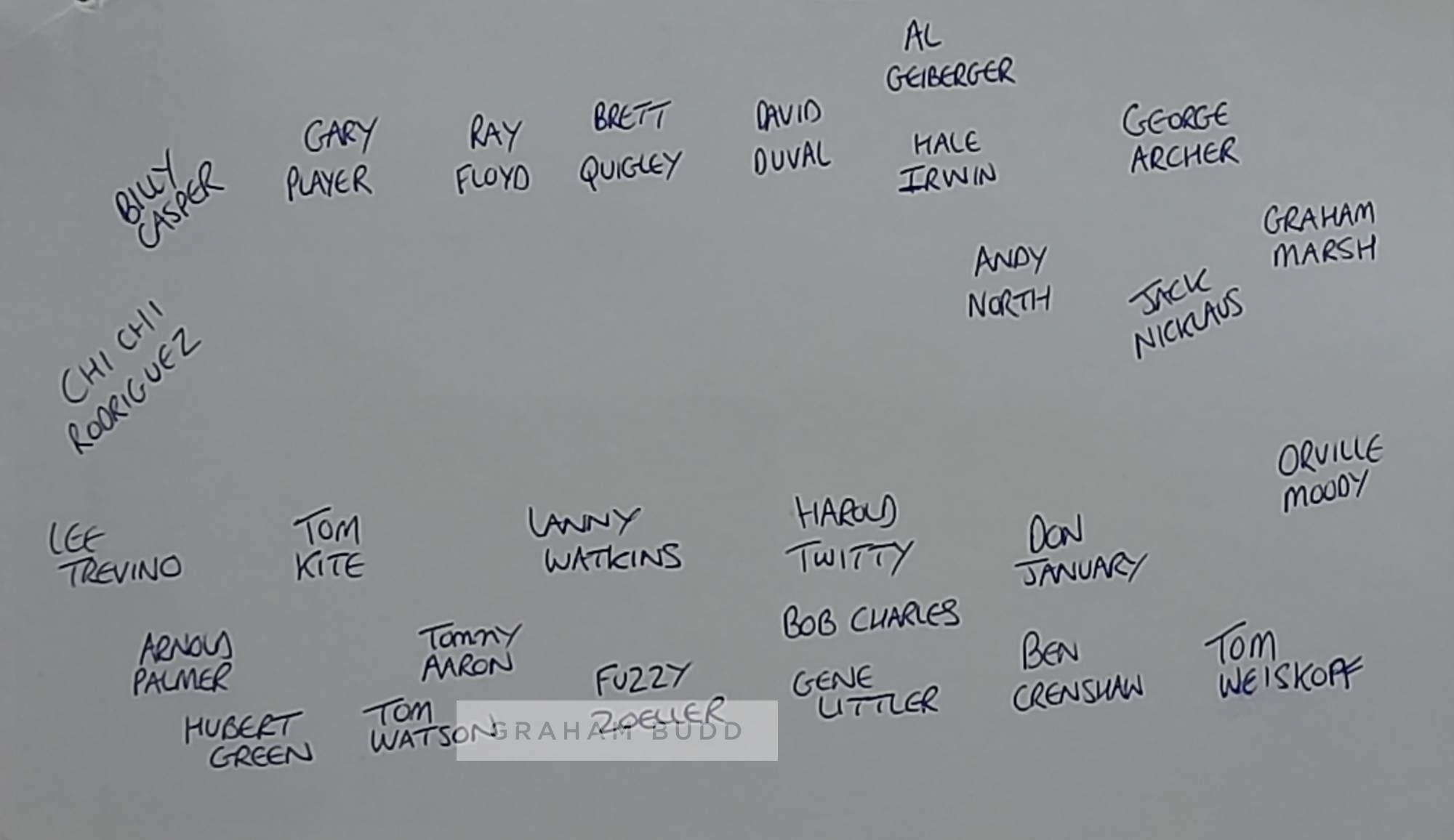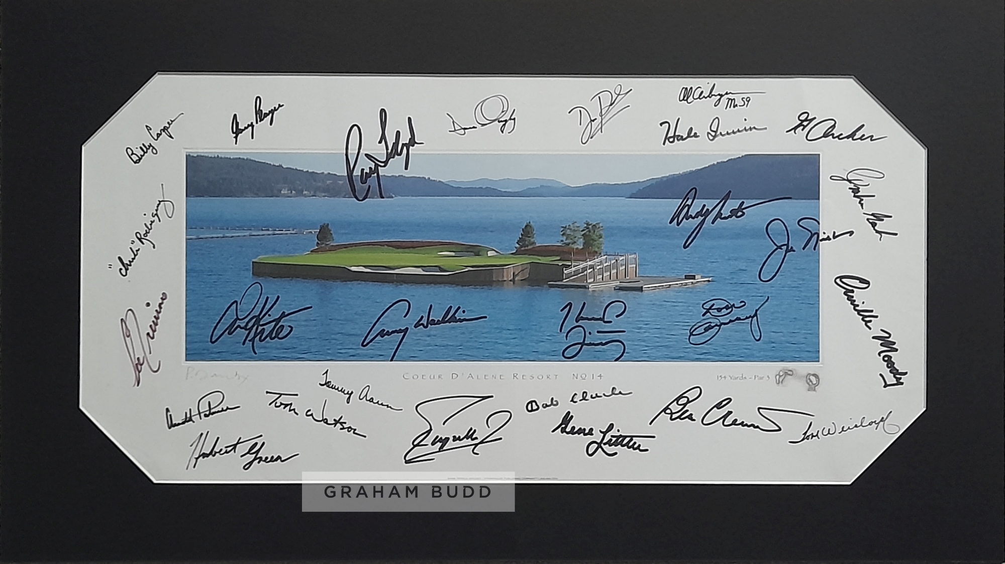 Coeur D'Alene Resort hole 14 print by artist Patrick Drickey signed by PGA golf legends, supeb image of this 154 yards, par 3 floating hols signed by 27 PGA golf legends and major winners', Jack Nicklaus, Arnold Palmer, Tom Watson, Lee Trevino, Gary Player, Bob Charles, Billy Casper, Ray Floyd, Brett Quigley, David Duval, Hale Irwin, Al Geiberger, George Archer, Graham Marsh, Orville Moody, Andy North, Don January, Tom Weiskopf, Ben Crenshaw, Gene Littler, Harold Twitty, Fuzzy Zoeller, Lanny Watkins, Tommy Aaron, Tom Kite, Chi Chi Rodriguez and Hubert Green. Mounted to 72.5 x 41cm ready to be framed. This was the property of Dermot Reeve ex England & Warwickshire cricketer, has accompanying letter stating how he came by it from ex golf coaching pro David Wright along with signature map