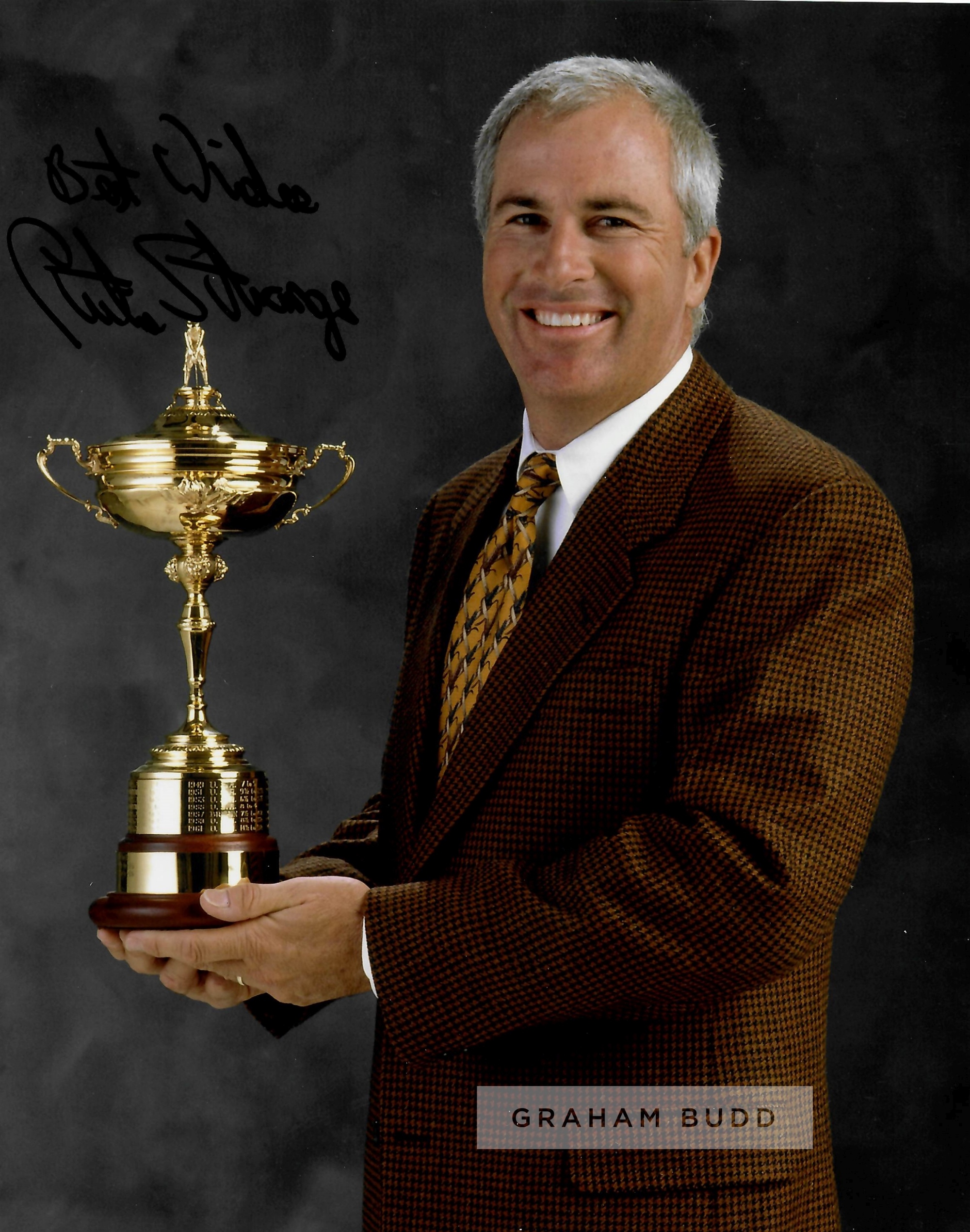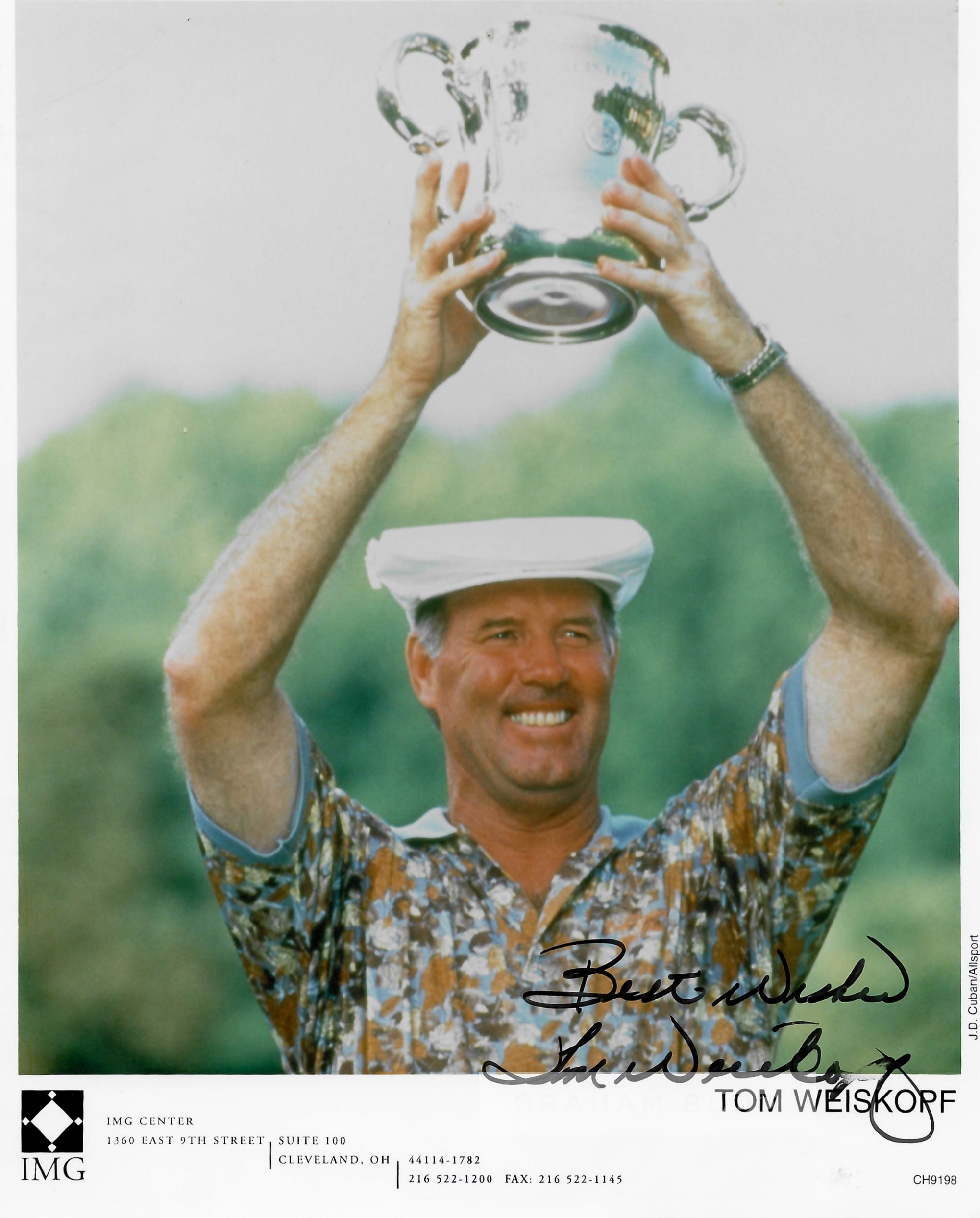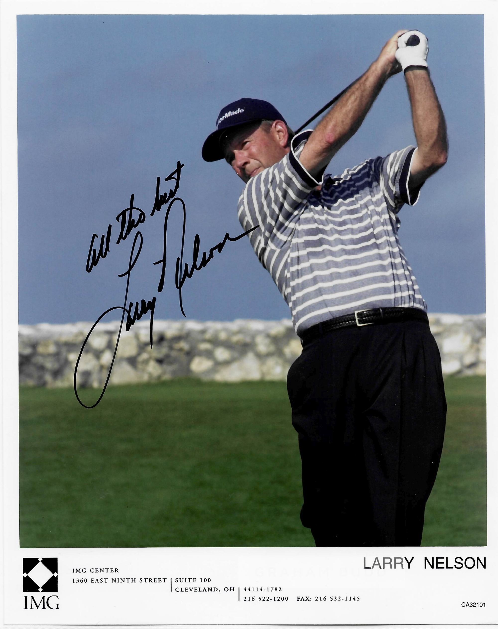 Collection of signed photographs of golf legends, including signed official IMG management photos of Mark Calcavecchia, Steve Stricker, David Frost, Larry Nelson, Tom Weiskopf and signed 8 by 10in. photographs of Curtis Strange, Brad Faxton, Jay Haas, Scott Hoch, Mark O’Meara, Ray Floyd and Fuzzer Zoeller, with official COA, (12)