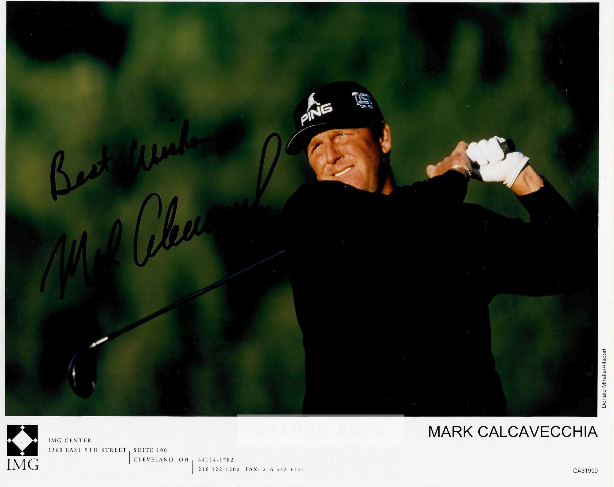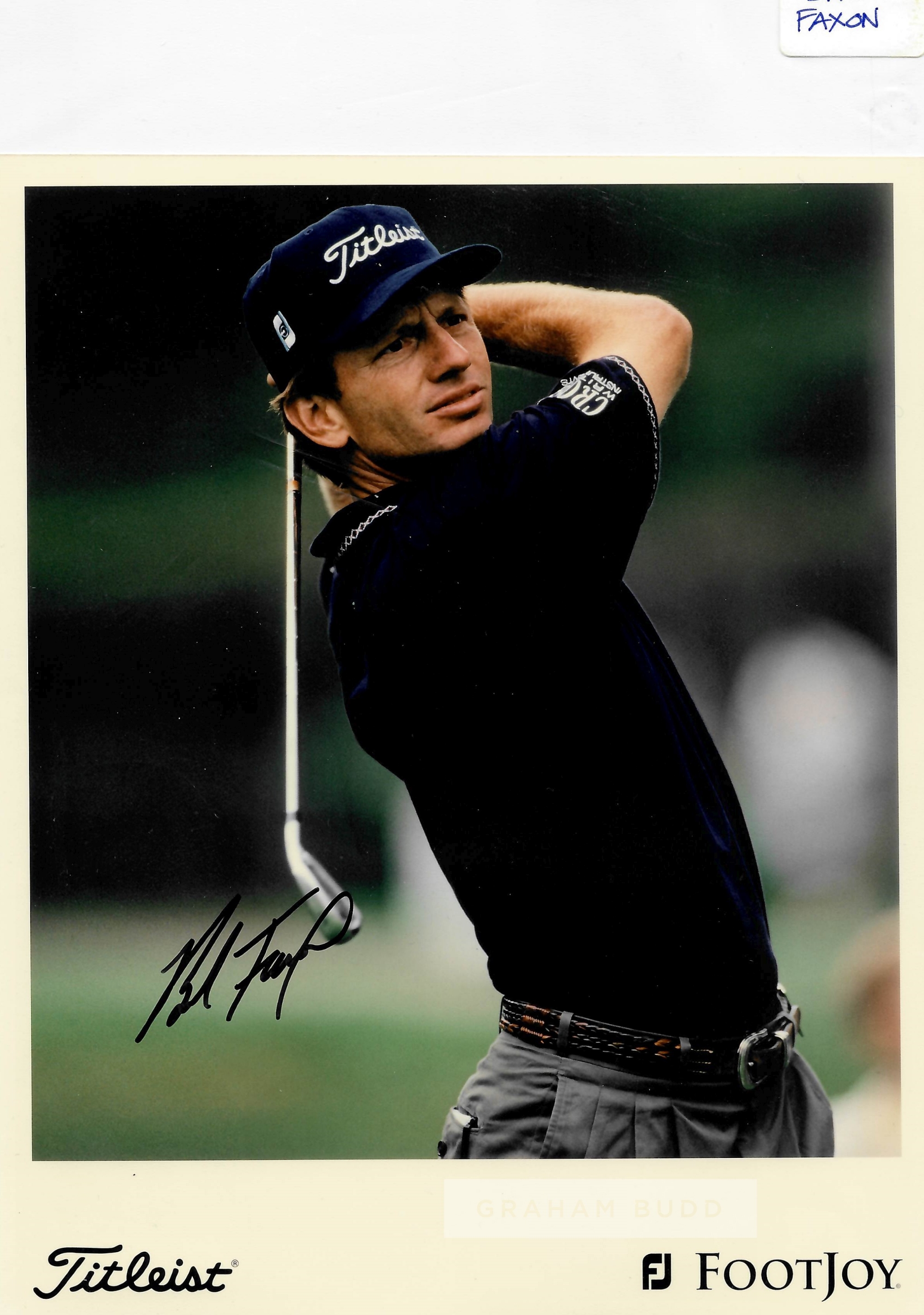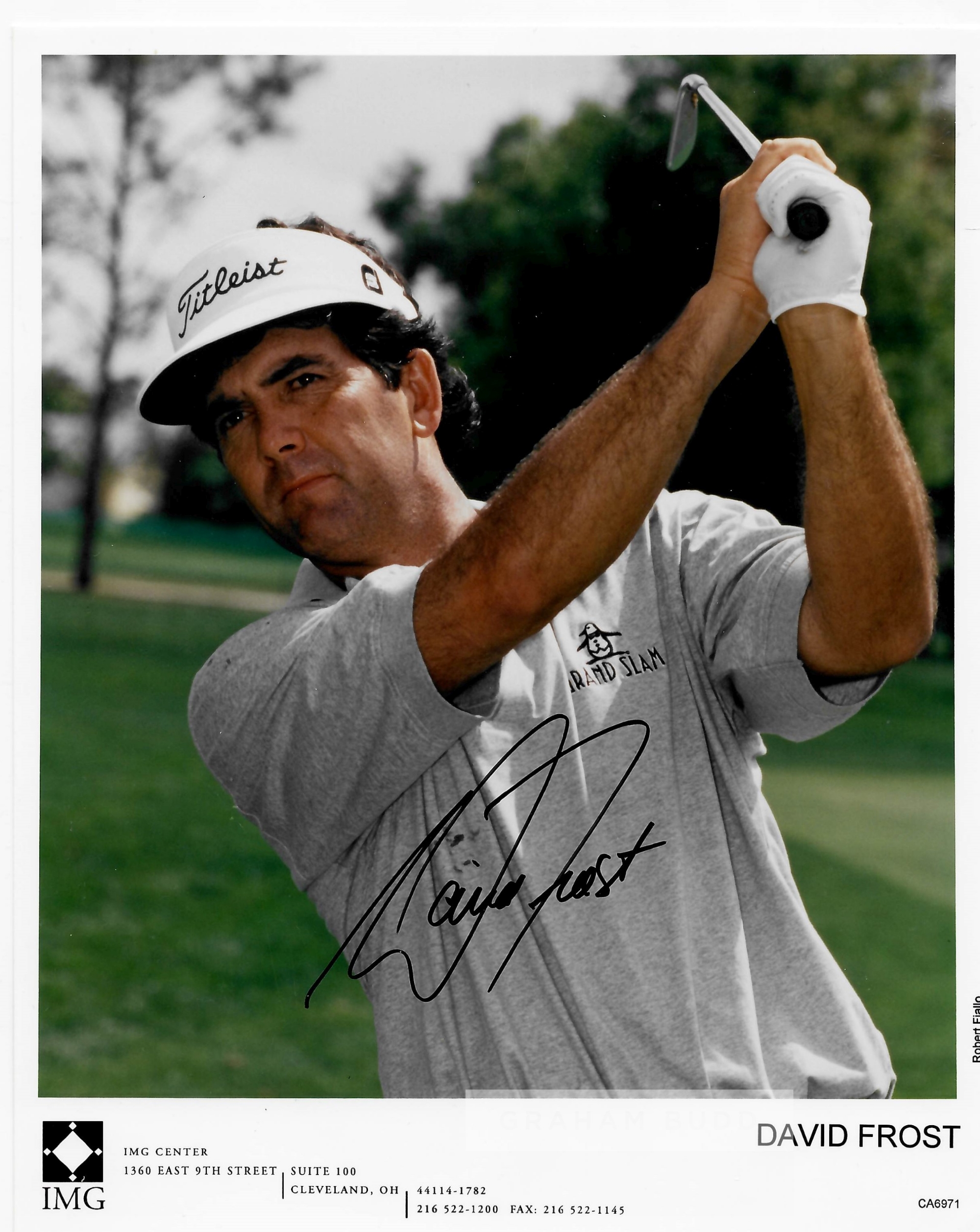 Collection of signed photographs of golf legends, including signed official IMG management photos of Mark Calcavecchia, Steve Stricker, David Frost,