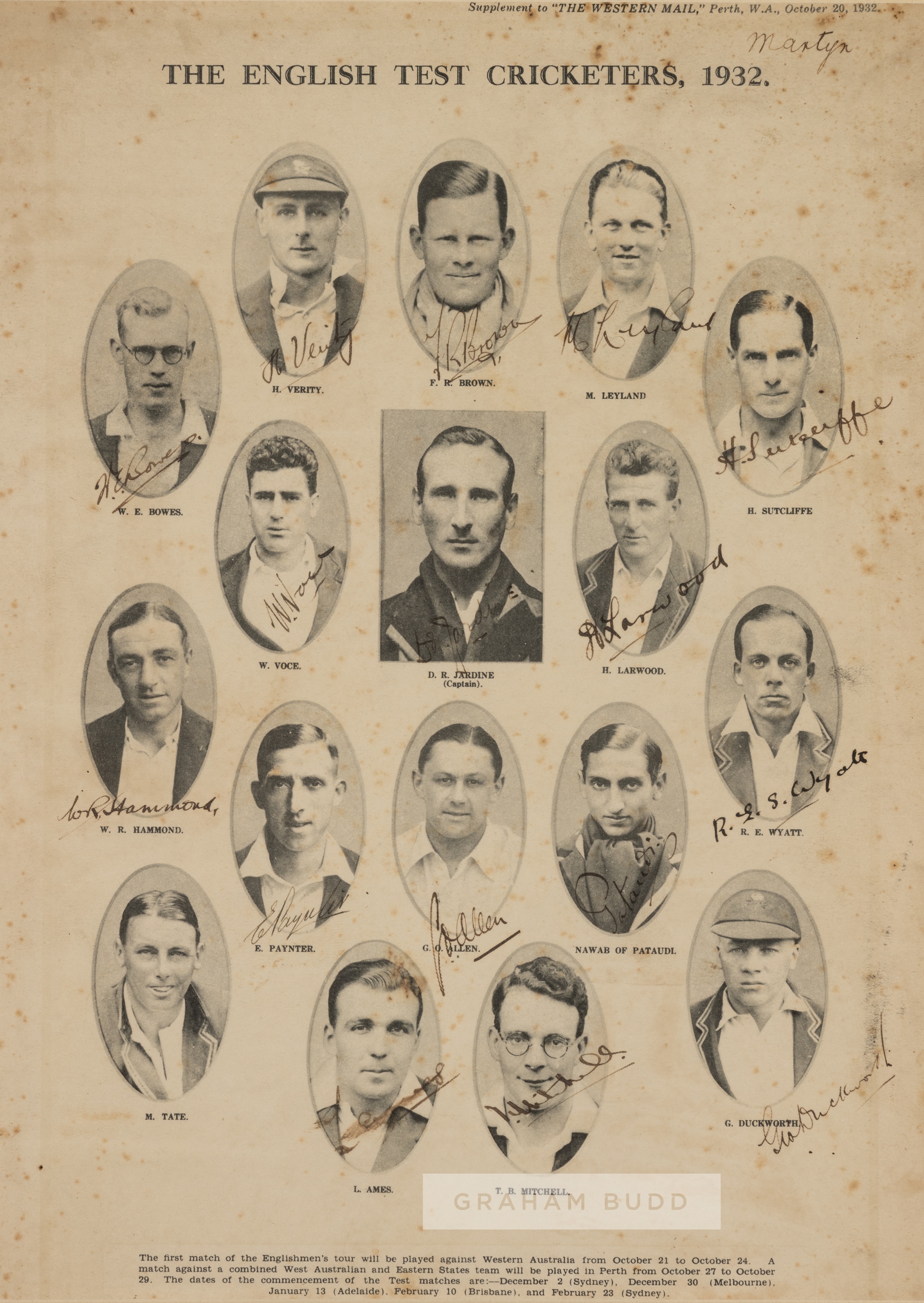 Signed "The English Test Cricketers 1932" printed supplement in The Western Mail, Perth, Australia, 20th October 1932, depicting individual cricketer