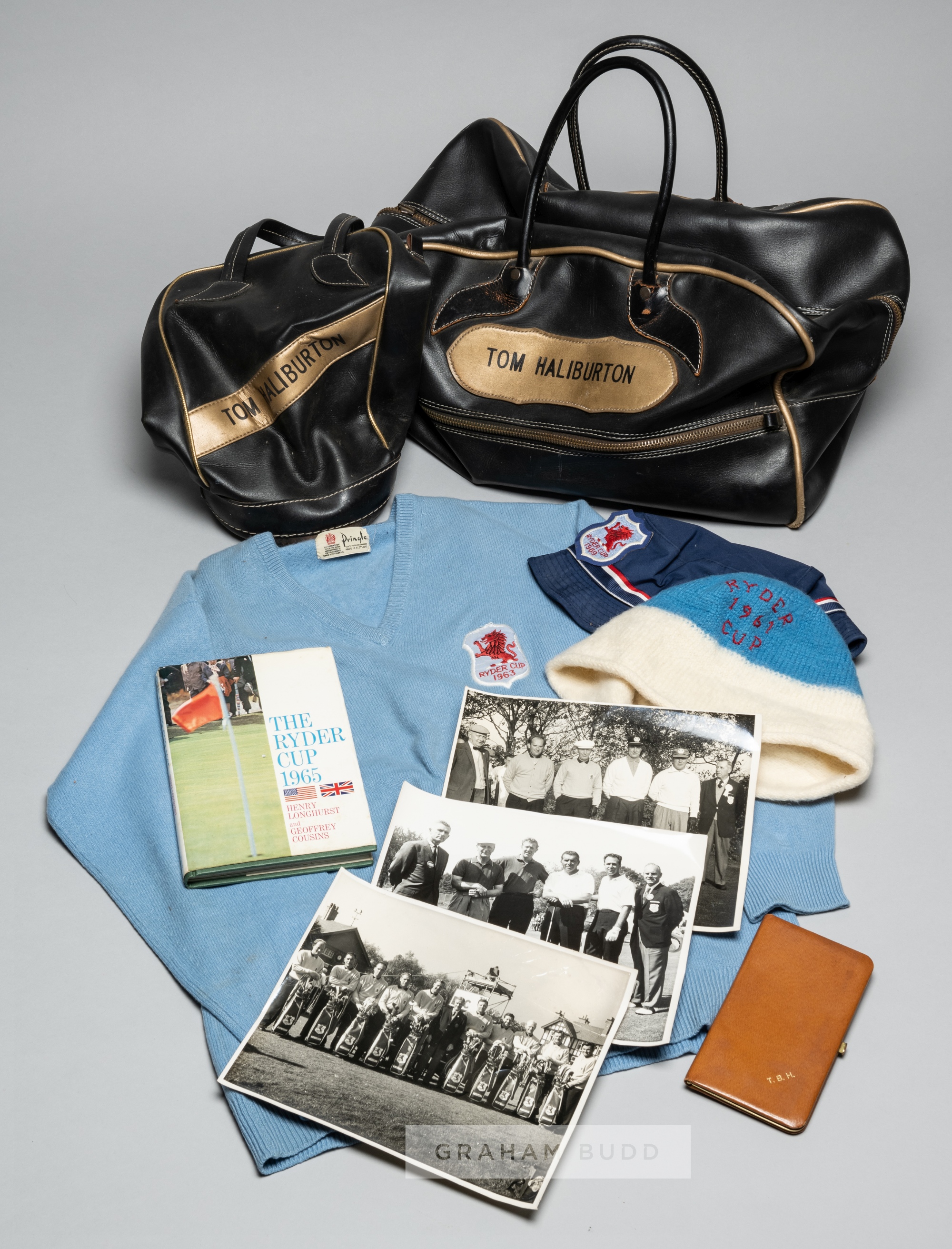 Scottish golfer's Tom Haliburton Ryder Cup and golfing memorabilia, comprising Ryder Cup 1961 blue and white wool cap, with RYDER CUP 1961 lettering; Ryder Cup 1963 blue Pringle v-neck jumper, bearing embroidered national emblem embroidered RYDER CUP 1963; navy Ryder Cup 1969 cap, by Richards & Thirkell, bearing national emblem embroidered RYDER CUP 1969; black leather kit bag and golf ball bag, both with TOM HALIBURTON name badge on each and RYDER CUP on the ball bag; a tan pigskin cigarette case, gilt tooled T.B.H.; ten 10 by 8in. b & w photographs of Tom Haliburton with Ryder Cup team mates; The Ryder Cup 1965 by Henry Longhurst & Geoffrey Cousins, first published 1965, hardback with d/j; sold together with two The Open St Andrews 1995 Marshall blue jackets and guest pass, (qty) Provenance: by family descent.