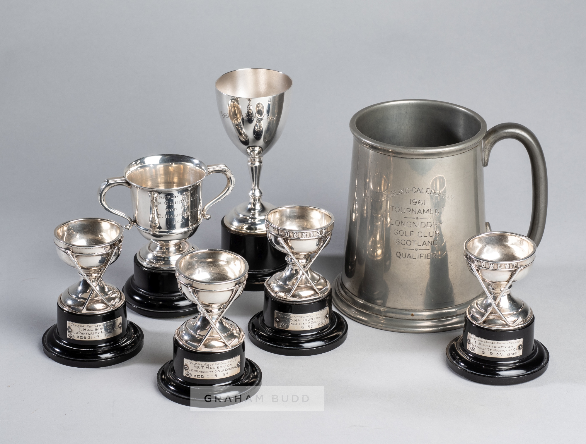 Five silver trophies awarded to the golfer Tom Haliburton between 1932 and 1936, comprising replica of the Goudie Cup won by T.B. Haliburton 1932, twin-handled squat trophy cup engraved, Birmingham 1932 Barker Brothers Silver Ltd, upon a black socle base, total height 9cm; two Dunlop squat trophies with DUNLOP lettering and two golf clubs crossed over, Birmingham 1934 by Elkington & Co Ltd, each raised upon black socle bases with silver engraved plaques for course record scores in 1936, total height 8cm; two squat trophies with two golf clubs crossed over, Birmingham 1913 by Elkington & Co Ltd, each raised upon black socle bases with silver engraved plaques for course record scores in 1935, total height 8cm, total silver weight 154gm.; sold together with The Glazer cup trophy cup with black socle base, silver-plated, total height 13cm; Carling-Caledonian 1961 tournament, Longniddry golf club Scotland qualifier tankard, pewter tankard, height 12cm., (7)