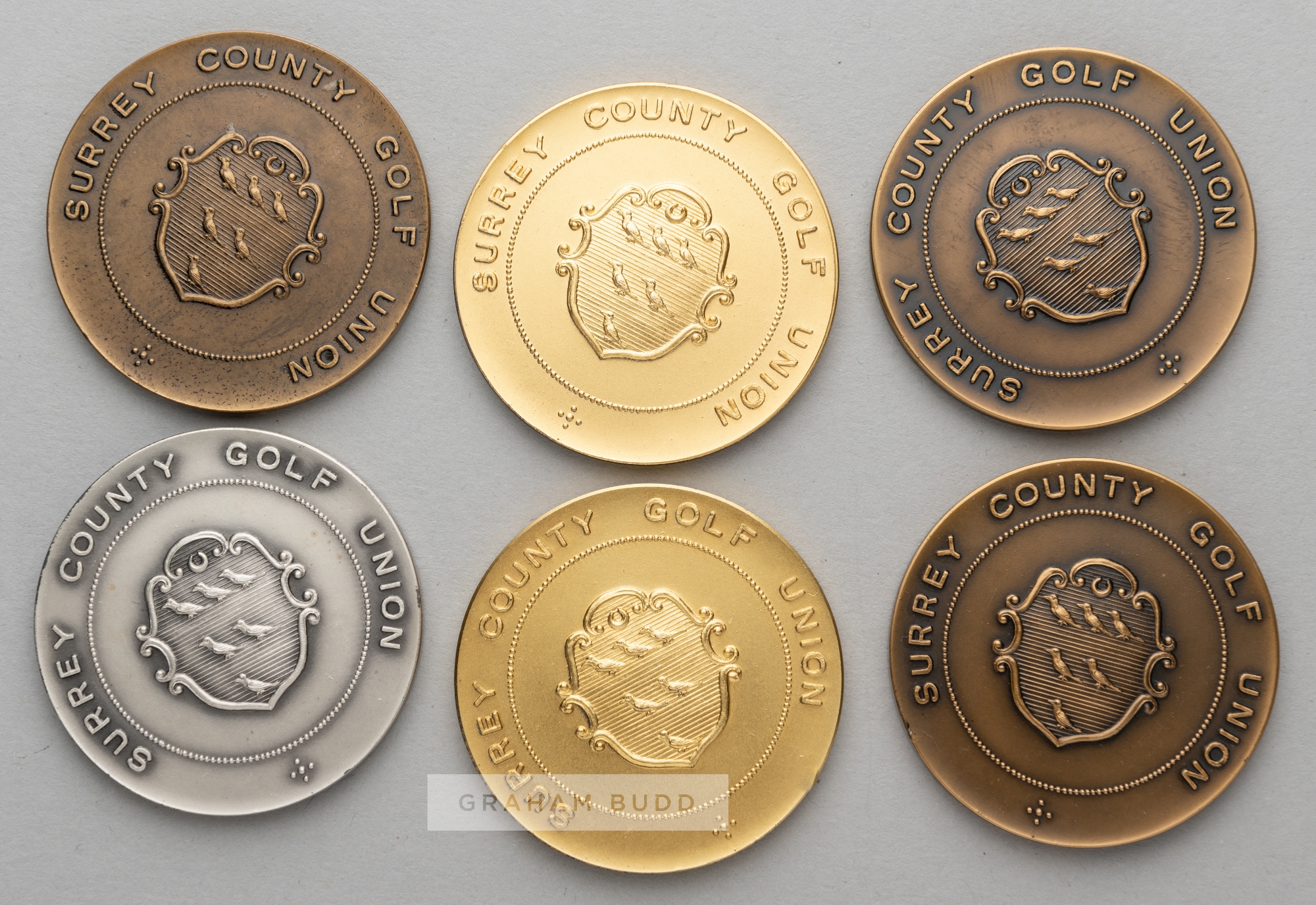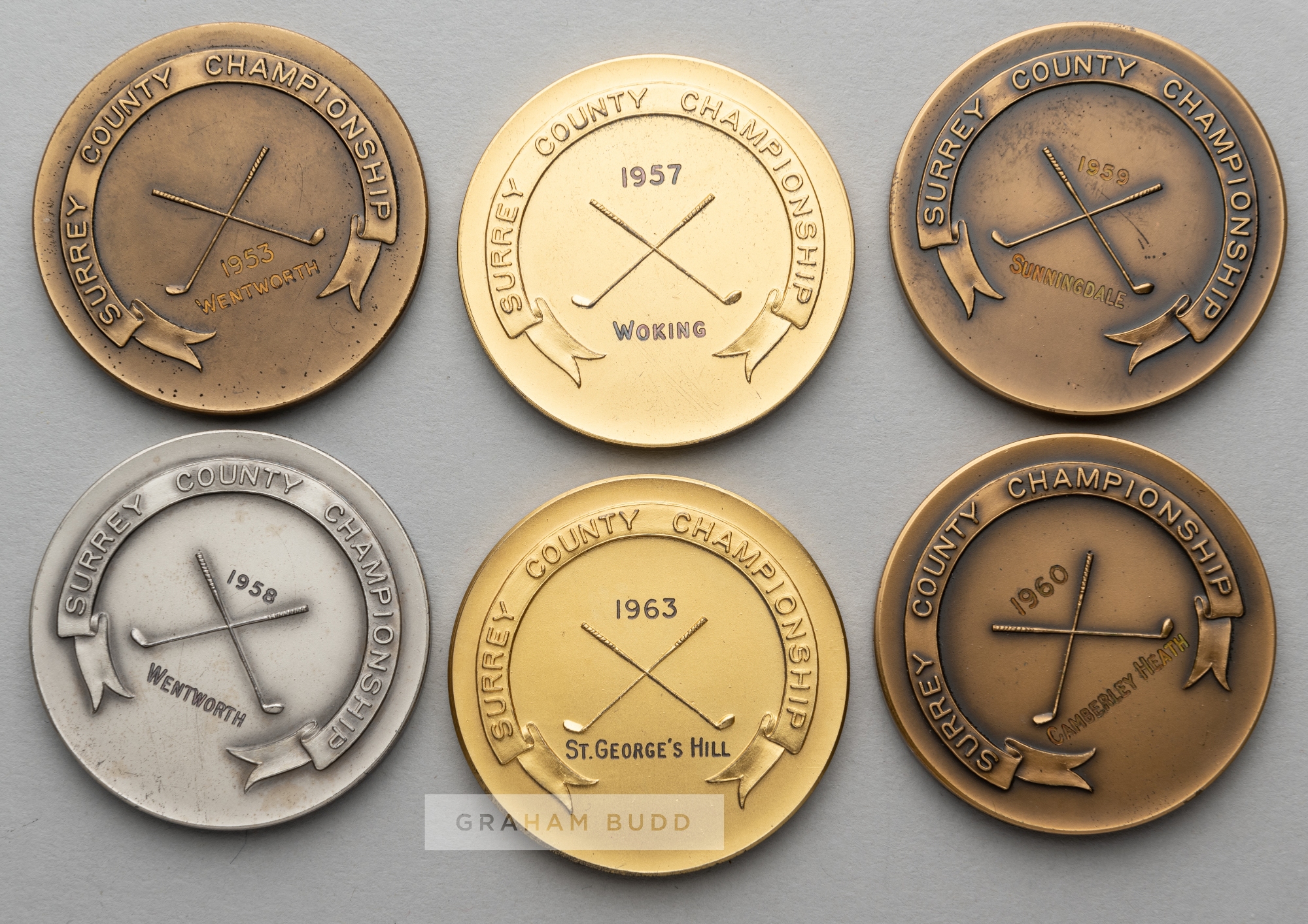 Six Surrey County Championship medals awarded to the golfer Tom Haliburton each obverse with SURREY COUNTY GOLF UNION and country crest and reverse with SURREY COUNTY CHAMPIONSHIPS and engraved with date and golf club for 1953 Wentworth, 1958 Woking, 1958 Wentworth, 1959 Sunningdale, 1960 Camberley Heath, 1963 St George's Hill, diameter 44mm, each in fitted case, (6)