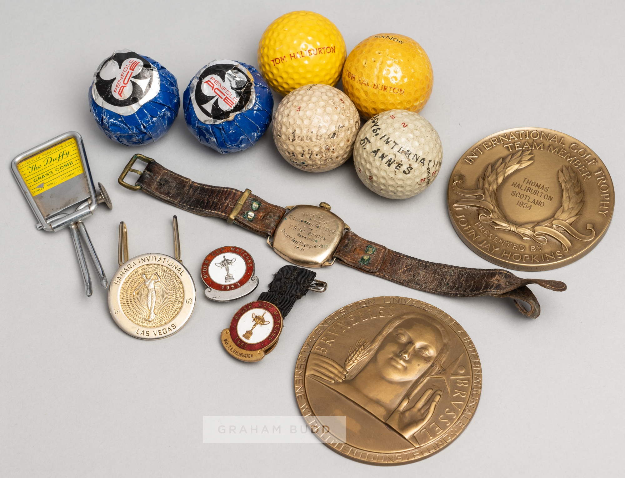 Miscellaneous golfing mementos from the carer of the golfer Tom Haliburton, comprising Nallog gold-plated wristwatch, with enamel dial and roman hours and brown leather strap, slight damage to dial and no glass; two Ryder Cup enamelled lapel badges for 1953 and 1961; CANADA CUP INTERNATIONAL GOLF TROPHY TEAM MEMBER medal awarded to THOMAS HALIBURTON SCOTLAND 1954, in fitted case, diameter 74mm.; EXPOSITION UNIVERSELLE INTERNATIONALLE ALGEMENE 1958 medal in fitted case, diameter 78mm.; two Penfold Ace wrapped golf balls; four further golf balls, one lettered TOM HALIBURTON, one with faint black marker writing BOYS INTERNATINAL ST ANNE'S; The Duffy grass comb; Sahara International Las Vegas clip; (13)