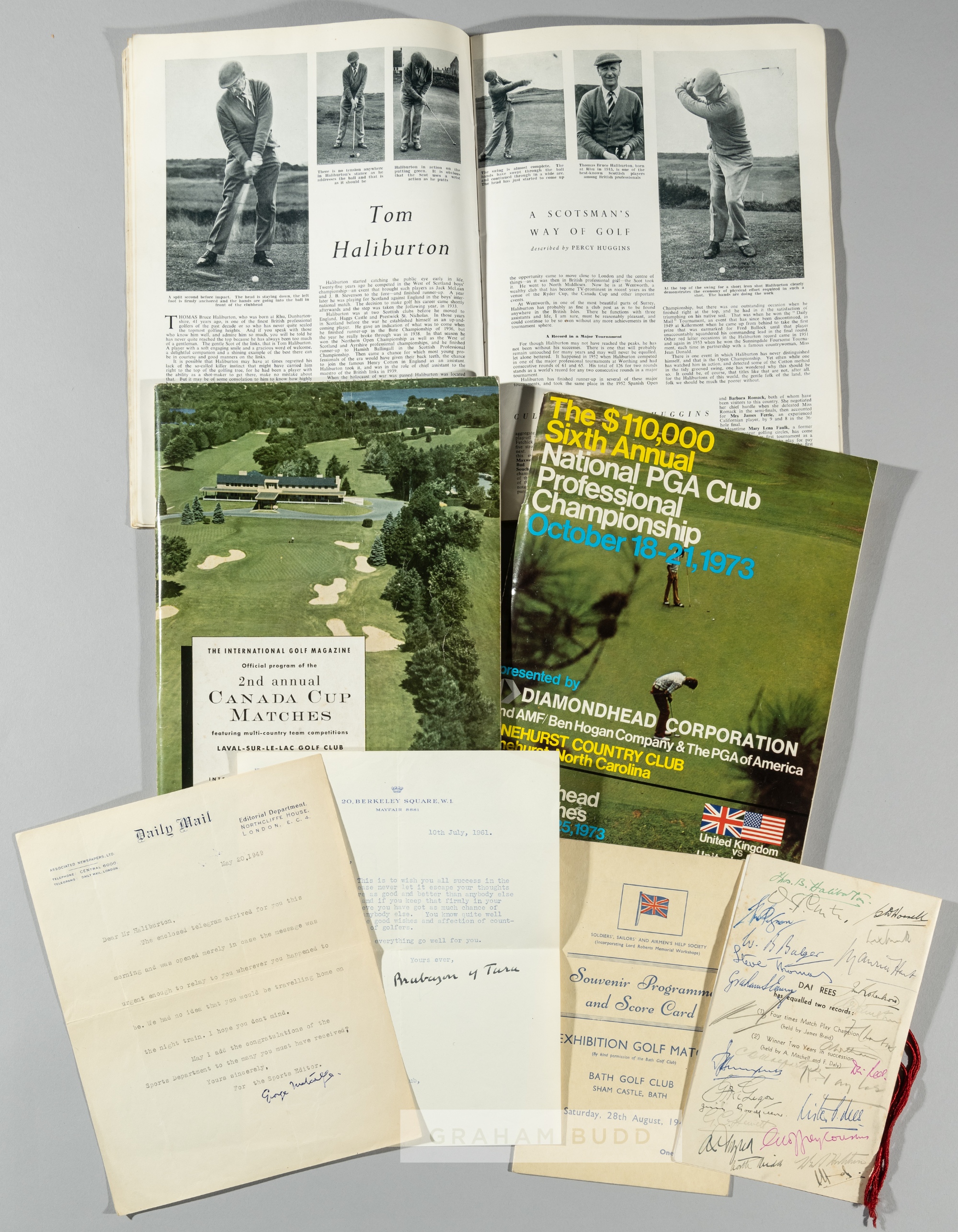 Selection of golfing books and ephemera from the collection of the golfer Tom Haliburton, comprising signed South Herts golf club dinner menu for DJ Rees, 20th October 1950; Exhibition golf match souvenir programme and score card at Bath golf club 28th August 1948; letters to Tom Haliburton from Lord Brabazon of Tara dated 10th July 1961 and from the Sports editor of the Daily Mail George Metcalfe dated 20th May 1949; Scottish Field December 1956 with article about Tom Halburton; Canada Cup matches programme at Laval-Sur-Le-Lac golf club August 1954; National PGA club professional Championship programme 18-21st October 1973; further newspaper and golfing magazine; sold together with a collection of books include Golf by Henry Cotton; Helensburgh Golf Club celebration of the first 100 years; The Ryder Cup by Dale Concannon; Swing to Better Golf by Ronnie White; Piccadilly World of Golf 1972; My Golfing Album by Henry Cotton; Master Golfers in Action by Louis T Stanley; Winning Golf by Byron Nelson; This Game of Golf by Henry Cotton; How to become a scratch golfer by Patrick Campbell; Swing the clubhead by Ernest Jones; Round in sixty eight by Henry Longhurst; On learning golf by Percy Boomer; Golf my life’s work by JH Taylor; The Golfer’s Year by Tom Scott & Webster Evans; Out of the rough by Joseph Shaw; How to play golf by Harry Vardon, (qty)
