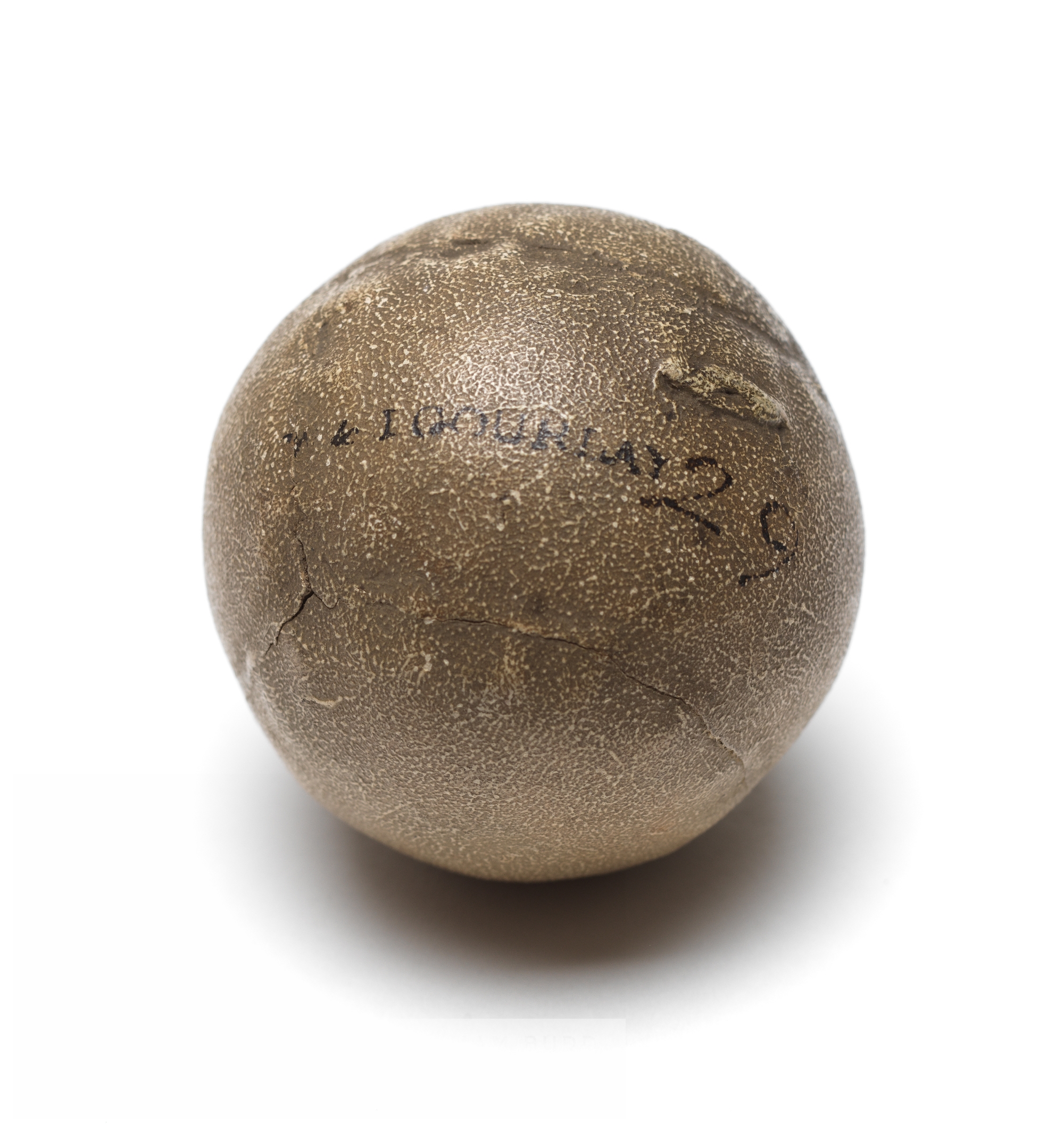 A fine mint unused ‘W & J GOURLAY’ stamped featherie ball, also inscribed with contemporary handwritten ‘29’ (denoting weight) and the no. ‘7’ on reverse side, the initials W & J (William & John) showing a very slight loss of definition, colouring slightly darker on the name side whereas as the reverse side shows consistent perfect light tone, all stitching tight, and roundness of ball extremely well preserved