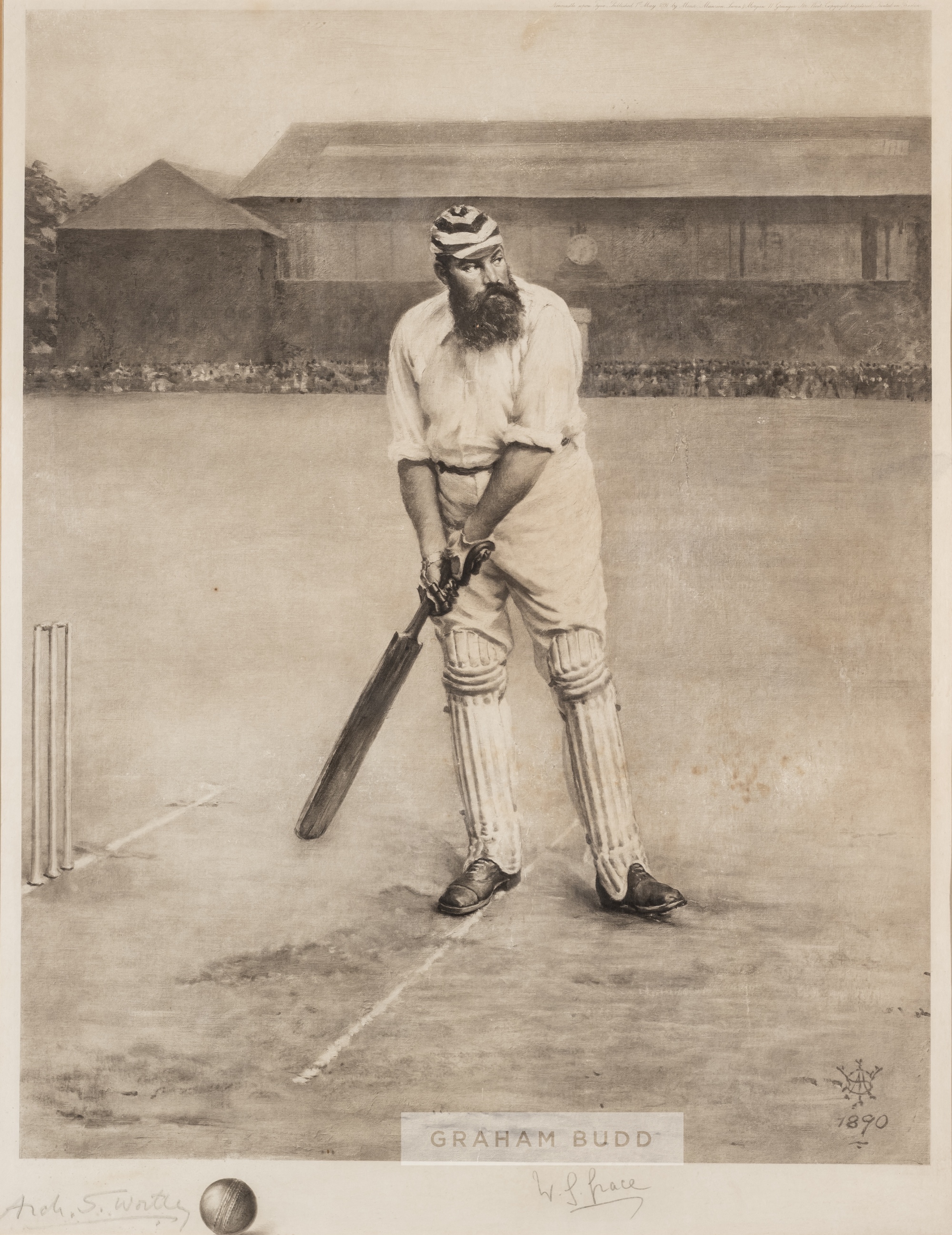 Signed W G Grace photogravure portrait after the famous painting by Archibald Stuart Wortley published in 1891, published by Mansen, Ivan & Morgan Newcastle upon Tyne, 1st May 1891, depicting W G Grace in front of the old real tennis courts at Lord's where the Mound Stand is now sited, bears stamp, signed in pencil lower margin by cricketer and artist, mounted, glazed and framed, overall 77 by 63cm. Please be aware all glass will be removed from framed and glazed items prior to posting and may result in delays to shipping your items. (This service is included in the cost of postage and packing). We can also totally remove all framing and mounts upon request to reduce shipping costs. Alternatively lots can be collected in person by prior appointment from NN8 1RT.