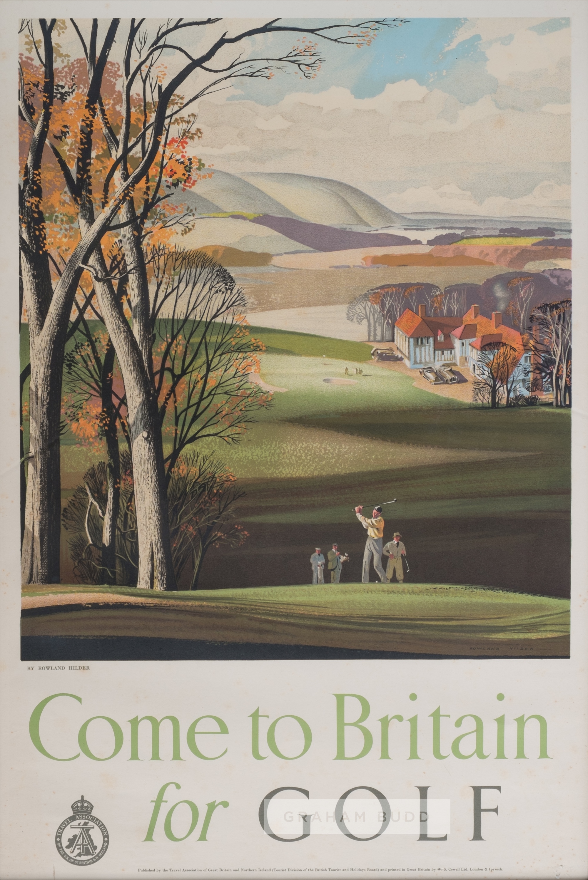 Rowland Hilder (British, 1905-1993) COME TO BRITAIN for GOLF, original poster print, image: 19½” x 29”, framed: 31½” x 22”, wear to frame, foxing to print around the edges and in the body, slight yellowing and faded Please be aware all glass will be removed from framed and glazed items prior to posting and may result in delays to shipping your items. (This service is included in the cost of postage and packing). We can also totally remove all framing and mounts upon request to reduce shipping costs. Alternatively lots can be collected in person by prior appointment from NN8 1RT.