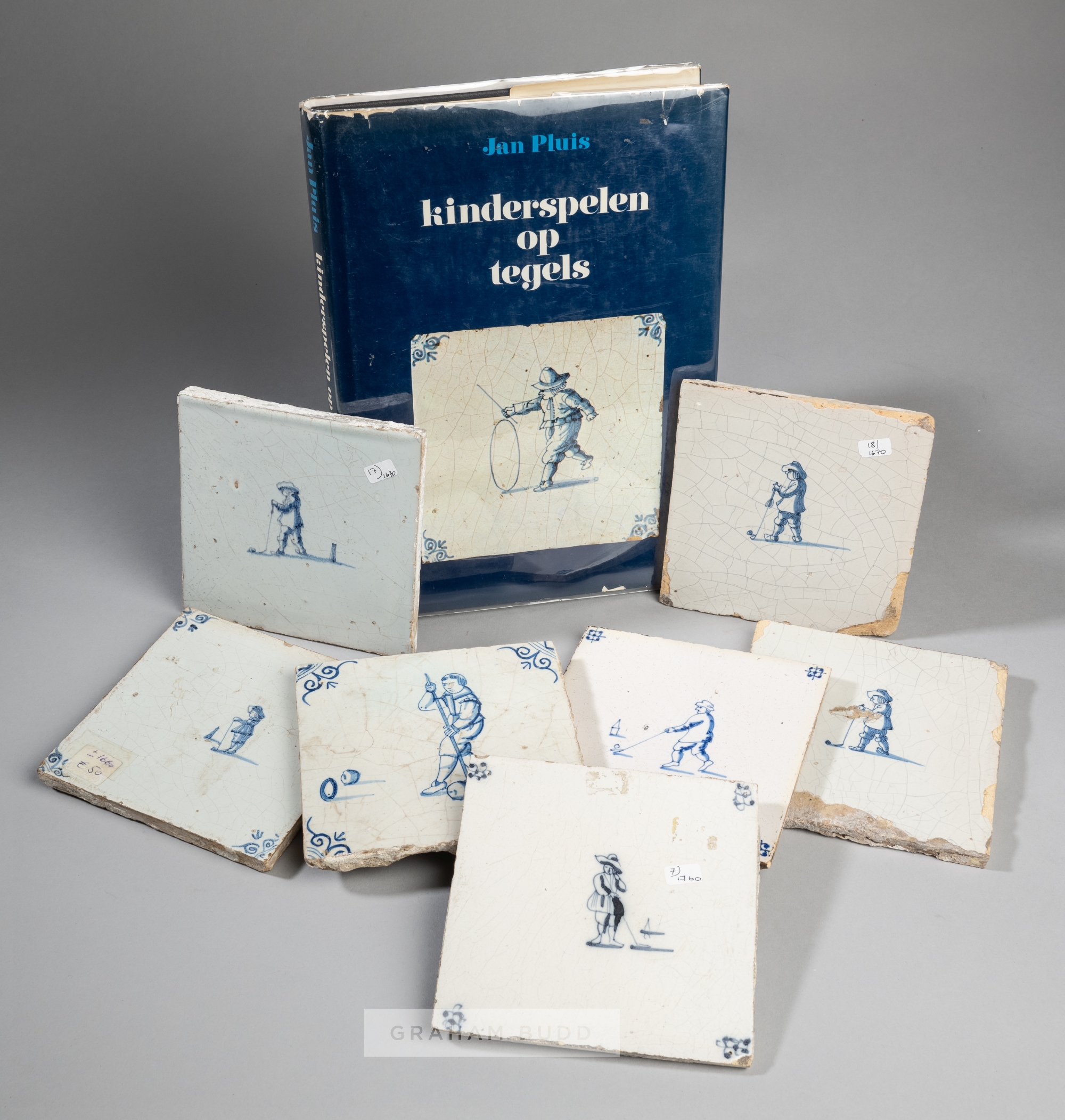 Seven early to mid 18th century Dutch blue and white earthenware tiles depicting the game of Kolf/Kolven and Beugelen, each of square form depicting a player in the centre, four with blue scroll decoration, majority measuring 12 by 12cm., sold together with KINDERSPELEN OP TEGELS translated to 'Children's games on tiles' by Jan Pluis, Van Gorcum Assen 1979. Dutch edition, hardcover with d/j, 316-page with with b & w illustrations, tiles bearing crazing and chips and losses to edges, wear to d/j with tears to edges, (8)