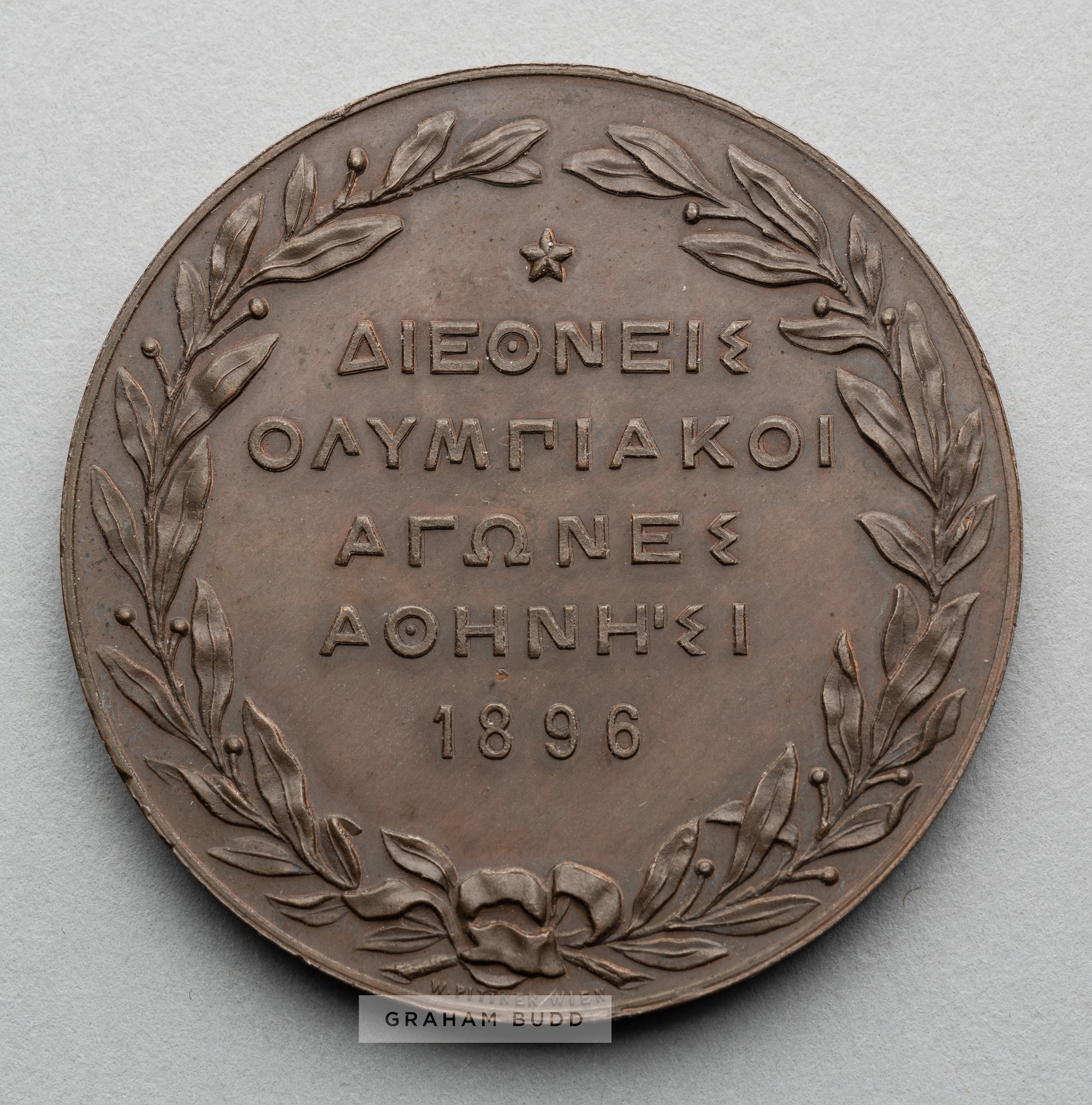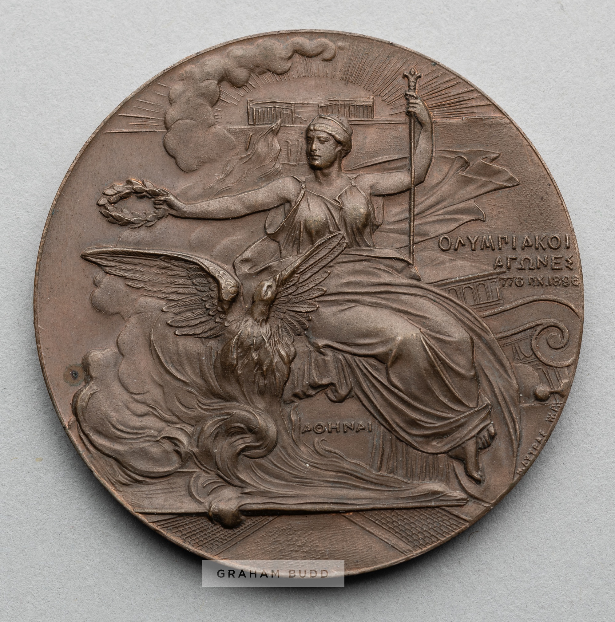 Athens 1896 Olympic Games participant's medal, designed by N Lytras, struck by Honto-Poulus, bronze, the obverse with seated Nike holding a laurel wreath over the phoenix rising from the flames, the Acropolis beyond, reverse with a Greek legend within a wreath, diameter 50mm., weight 58gr.