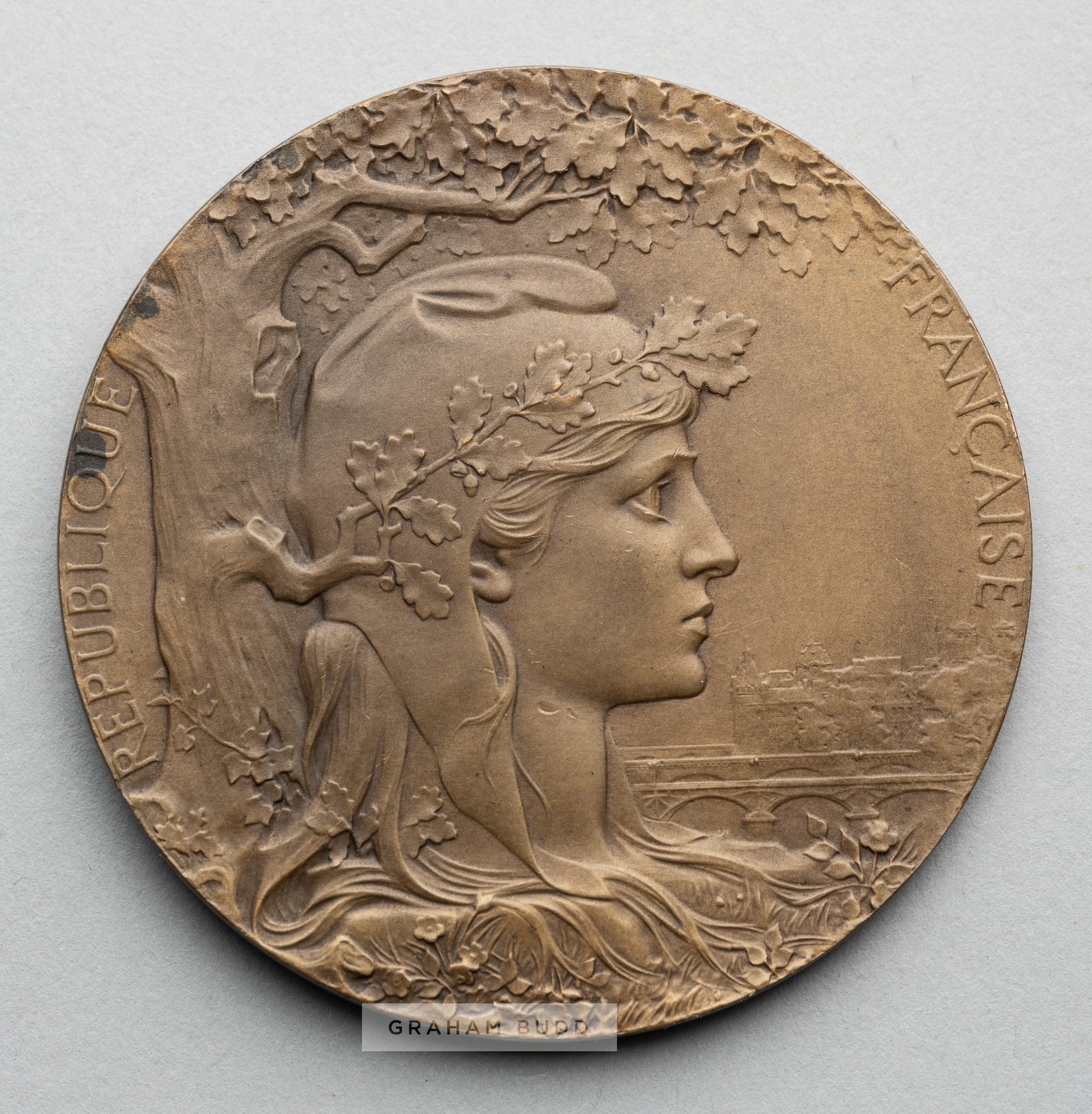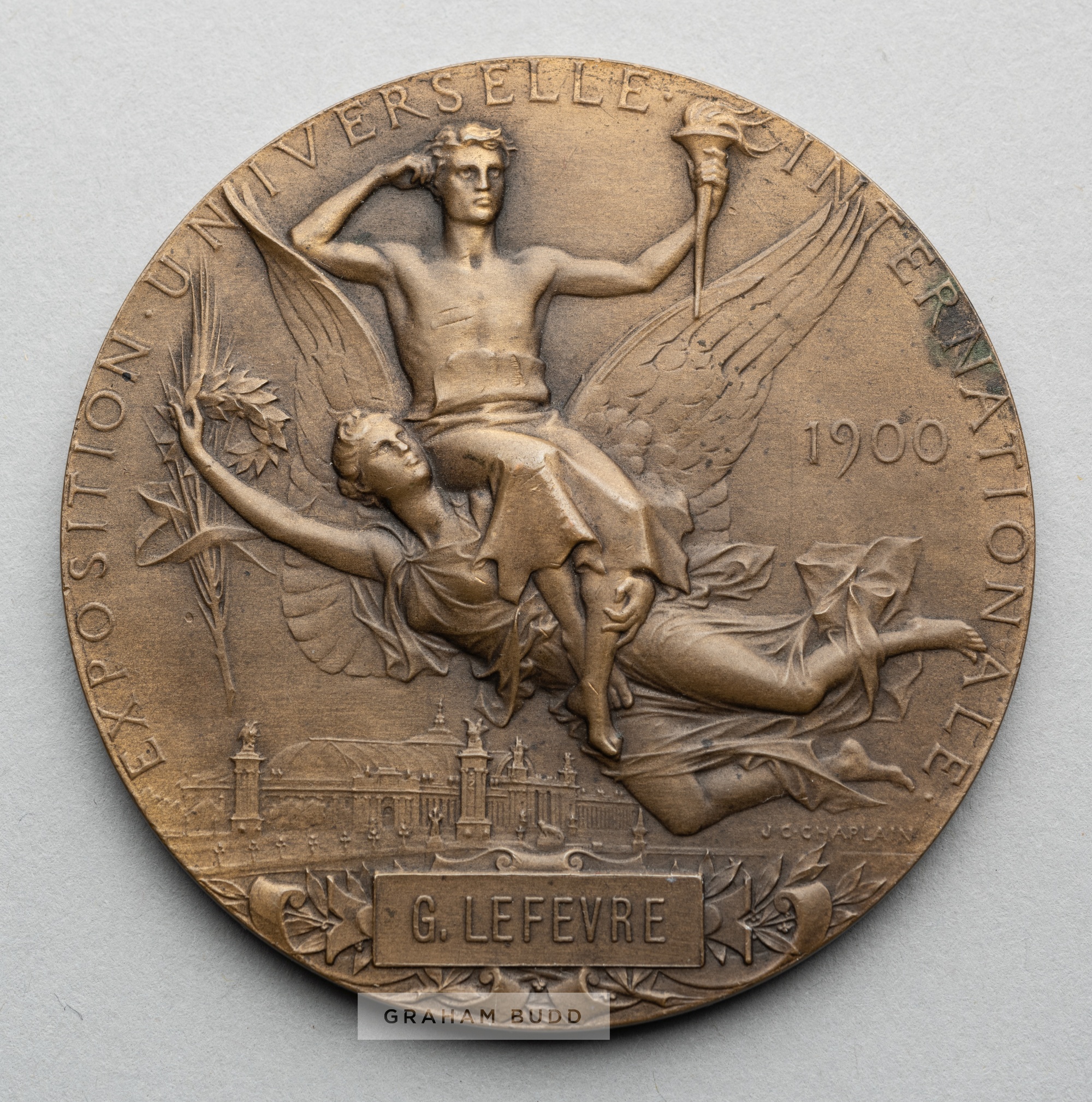 Paris 1900 Exposition Universelle Internationale award medal, designed by Chaplain, bronze, obverse depicts head of France with city view in the background and inscribed REPUBLIQUE FRANCAISE, reverse depicts winged figure of Victory holding laurel wreath and a palm branch and a winner on her back, inscribed EXPOSITION UNIVERSELLE INTERNALE 1900 G. LEFEVRE, stamped BRONZE on rim, diameter 63mm, weight 102gms, bears minor ink stains near rim on both sides Since no participation medals were awarded for the 1900 Olympic Games held in conjunction with the international exhibition, this is deemed to be the best representation to complete a collection.