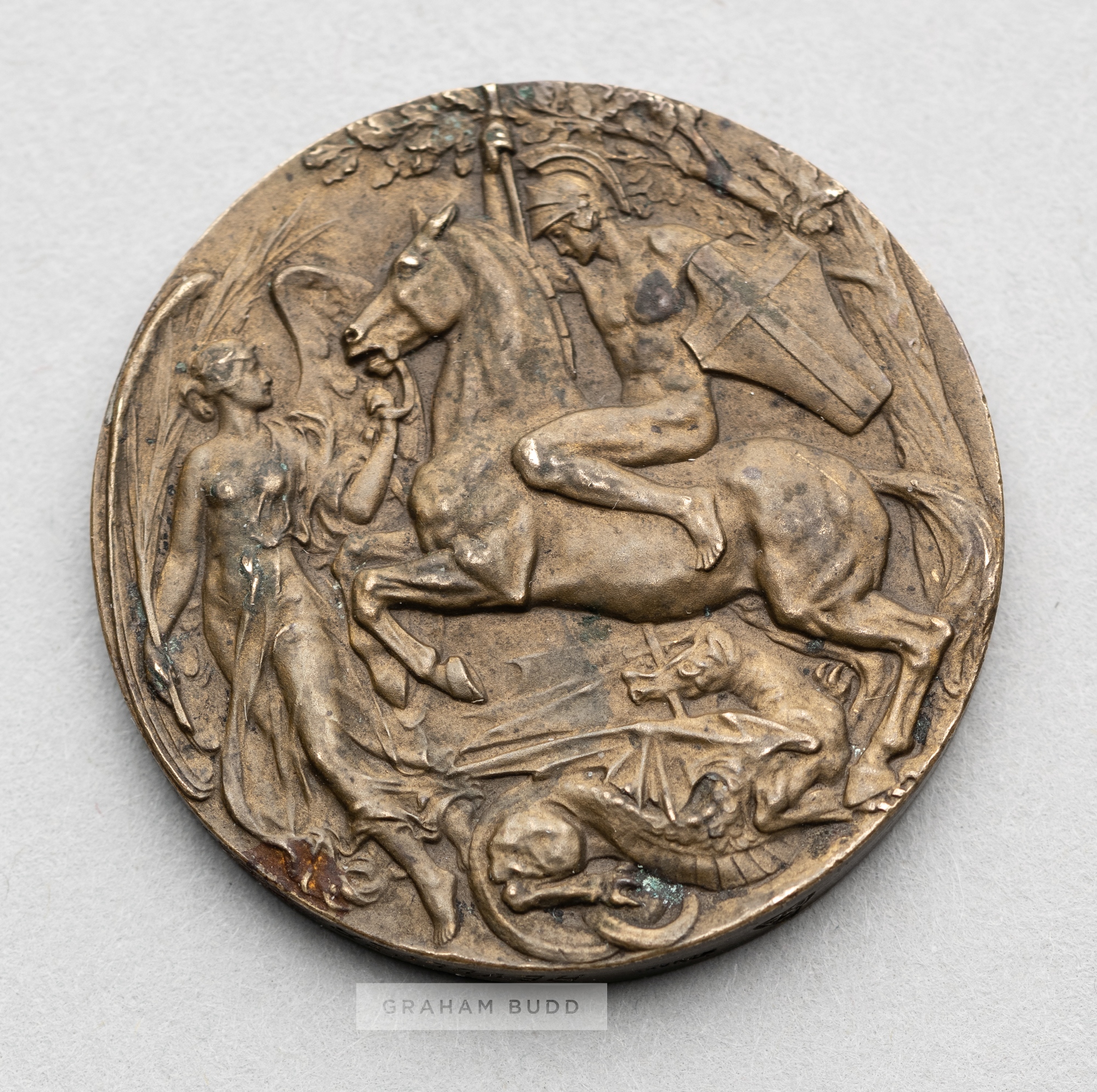London 1908 Olympic Games bronze prize medal awarded to the Great Britain team in the Men's 50 Yard Revolver and Pistol competition, 11th July, bronze, obverse depicting two women crowning an athlete with a laurel wreath, reverse depicting St George slaying the dragon, rim engraved THIRD PRIZE REVOLVER TEAMS (50 YARDS), VAUGHTON, designed by Berthram Mackennal, Vaughton & Sons, diameter 33mm., weight 19gms. Great Britain team comprised of Geoffrey Coles, William Ellicott, Henry Lynch-Staunton and Jesse Wallingford.