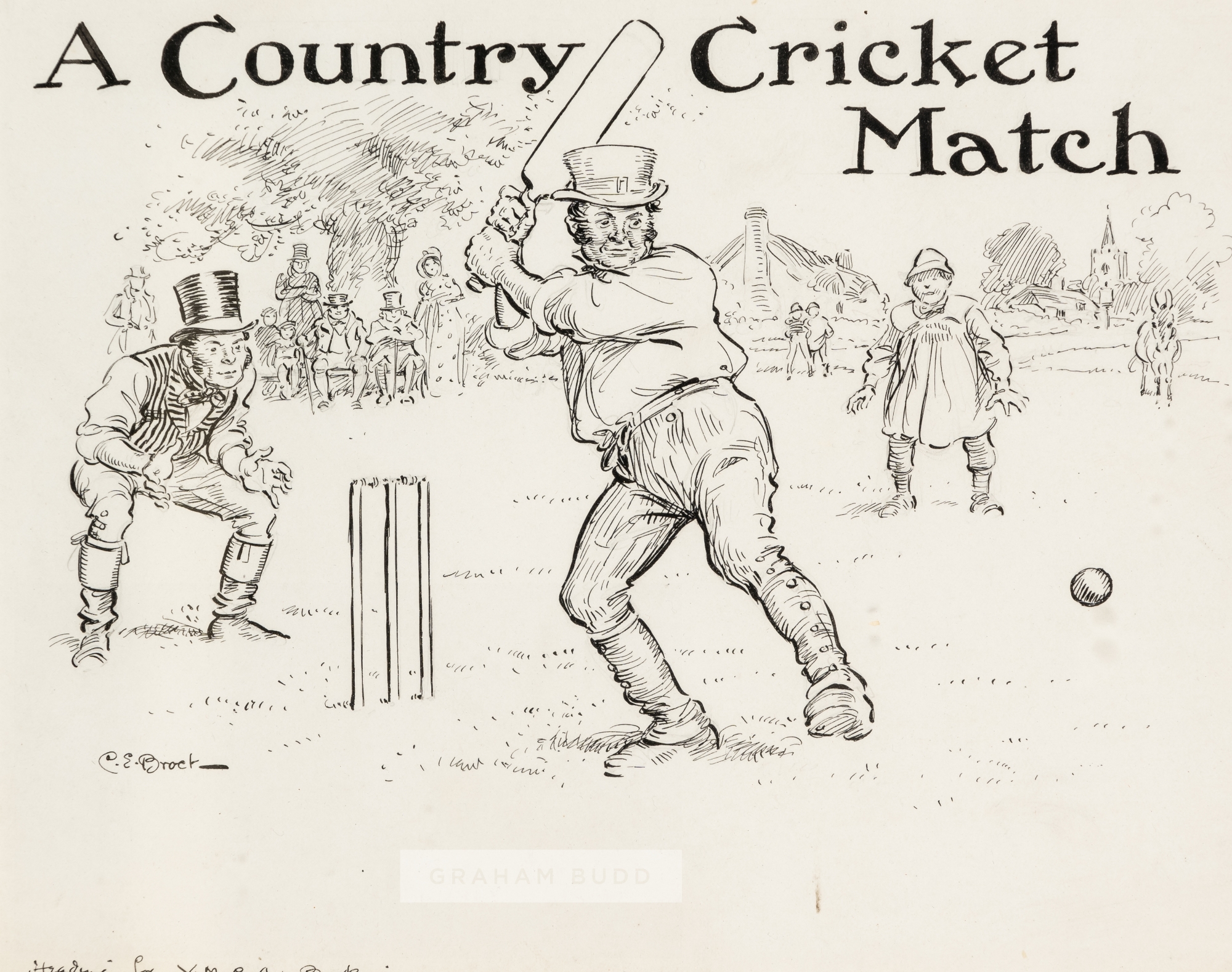 Charles Edmond Brock (British, 1870-1938) A Country Cricket Match, circa 1920s, pen and ink drawing, depicting gentlemen on the village green playing cricket. Left margin signed by artist, lower margin bears handwritten note HEADING FOR Y.M.C.A. BOOK, mounted, glazed and framed, overall size 33 by 36cm. Please be aware all glass will be removed from framed and glazed items prior to posting and may result in delays to shipping your items. (This service is included in the cost of postage and packing). We can also totally remove all framing and mounts upon request to reduce shipping costs. Alternatively lots can be collected in person by prior appointment from NN8 1RT.