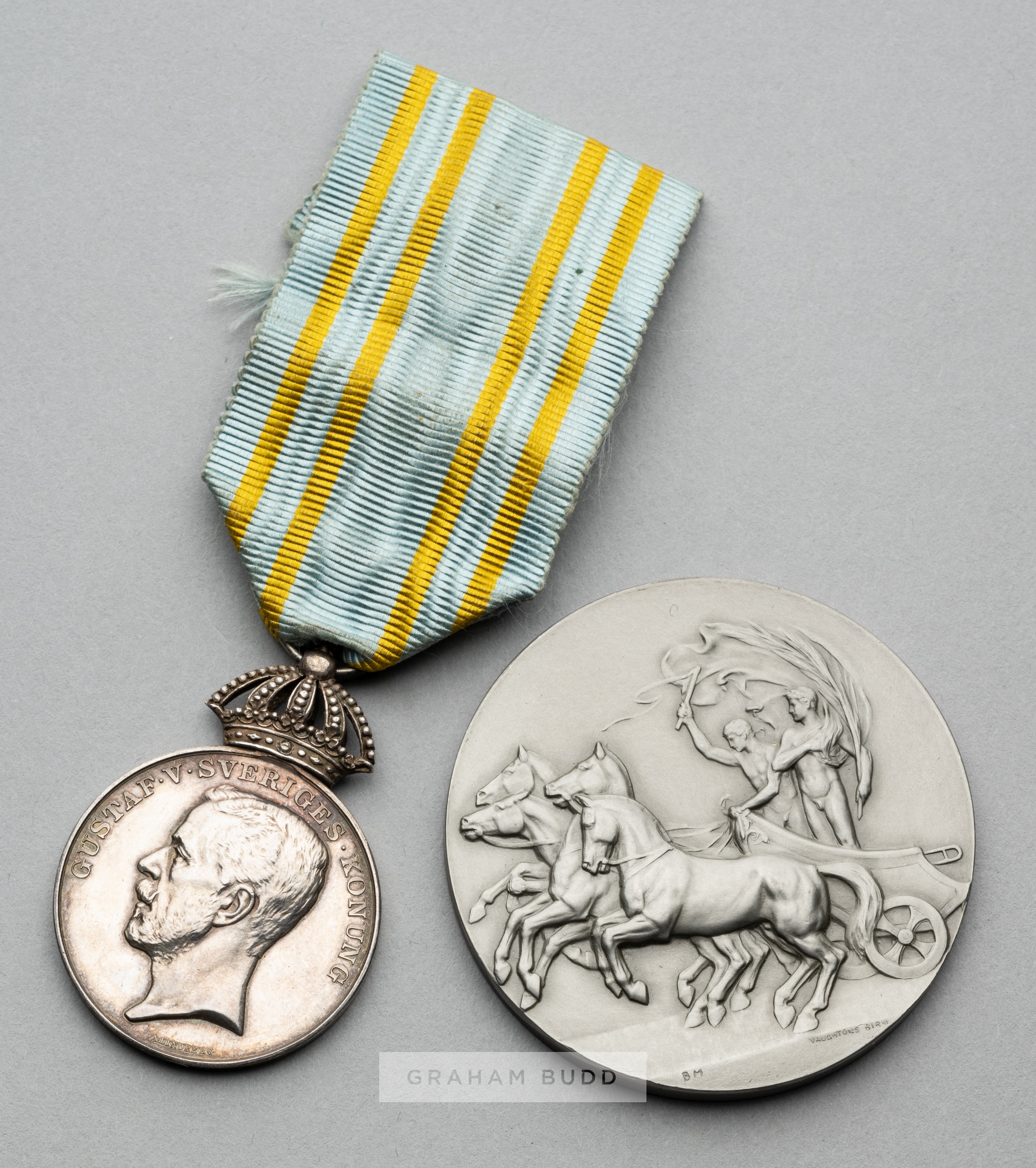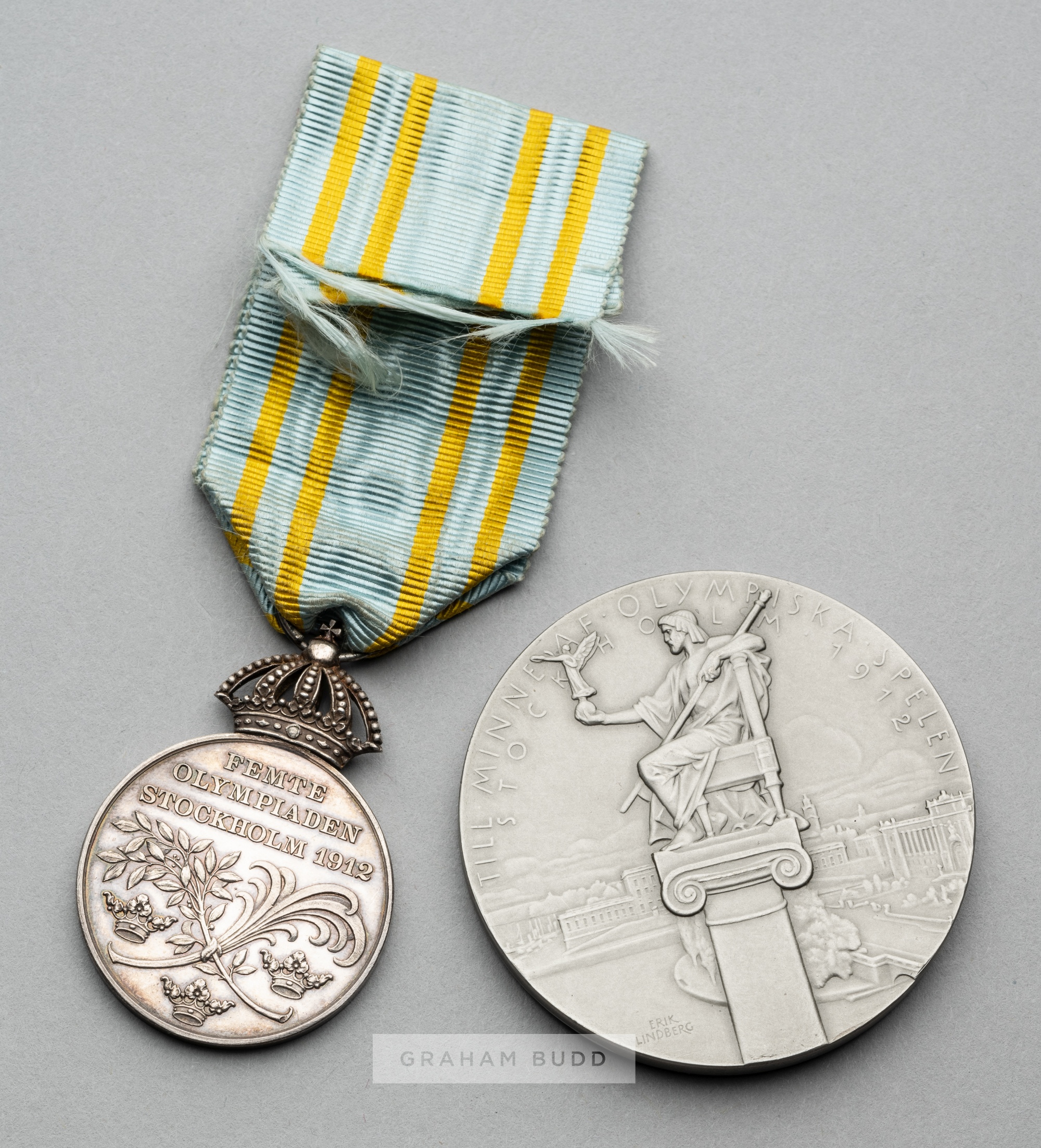 Stockholm 1912 Olympic Games participation medal, designed by Bertram McKennal, pewter, obverse with Zeus seated on an Ionian column holding figure of Nike with a view of Stockholm in the background, reverse with a triumphant athlete in a quadriga, of circular form, diameter 51mm., weight 47 gr., in associated case; sold together with a miniature Olympic merit medal, silver, obverse featuring the head of King Gustaf V of Sweden, reverse with Olympic inscription over laurel and crowns, ring suspension in form of royal crown, ribbon in the colours of the Swedish flag (2)