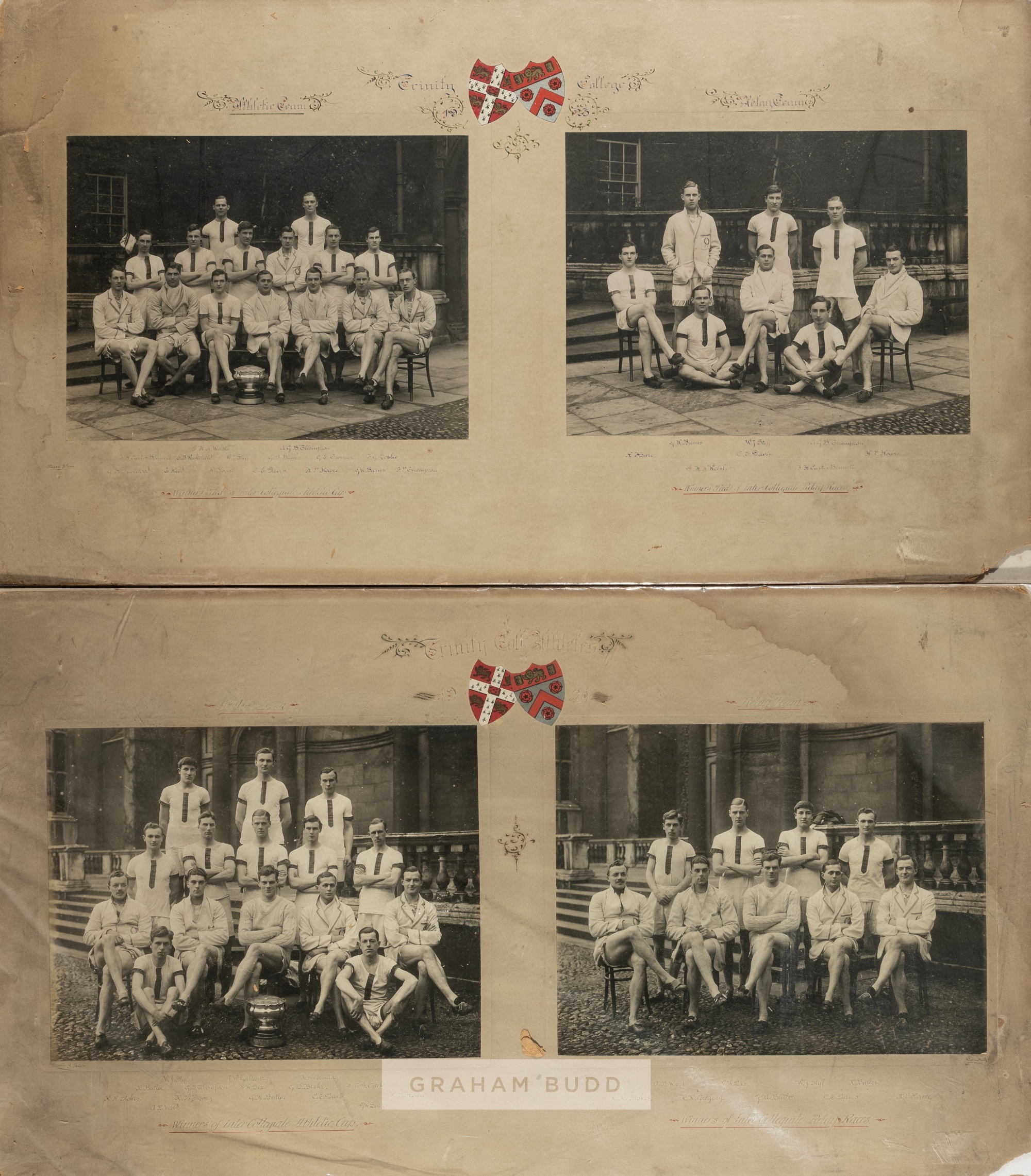 Collection of matted photographs relating to the South African athlete C.R. Davis, including at St Paul's school first fives team 1919; double photograph Trinity College Cambridge athletics and relay teams 1923 with another similar double image; South African team and officials at 1924 Paris Olympic Games, with partial legend, damage to board with losses; unknown picture possibly from school days in South Africa, each board bears wear with some losses, (5) C.E. Davis was a South African who came to England to study at Cambridge University, an accomplished athletic in many fields, he had the misfortune to be here at the time when England had many great runners and for this reason he decided to represent South Africa at the 1924 Paris Olympic Games and ran in the 800 and 1500 metre races.