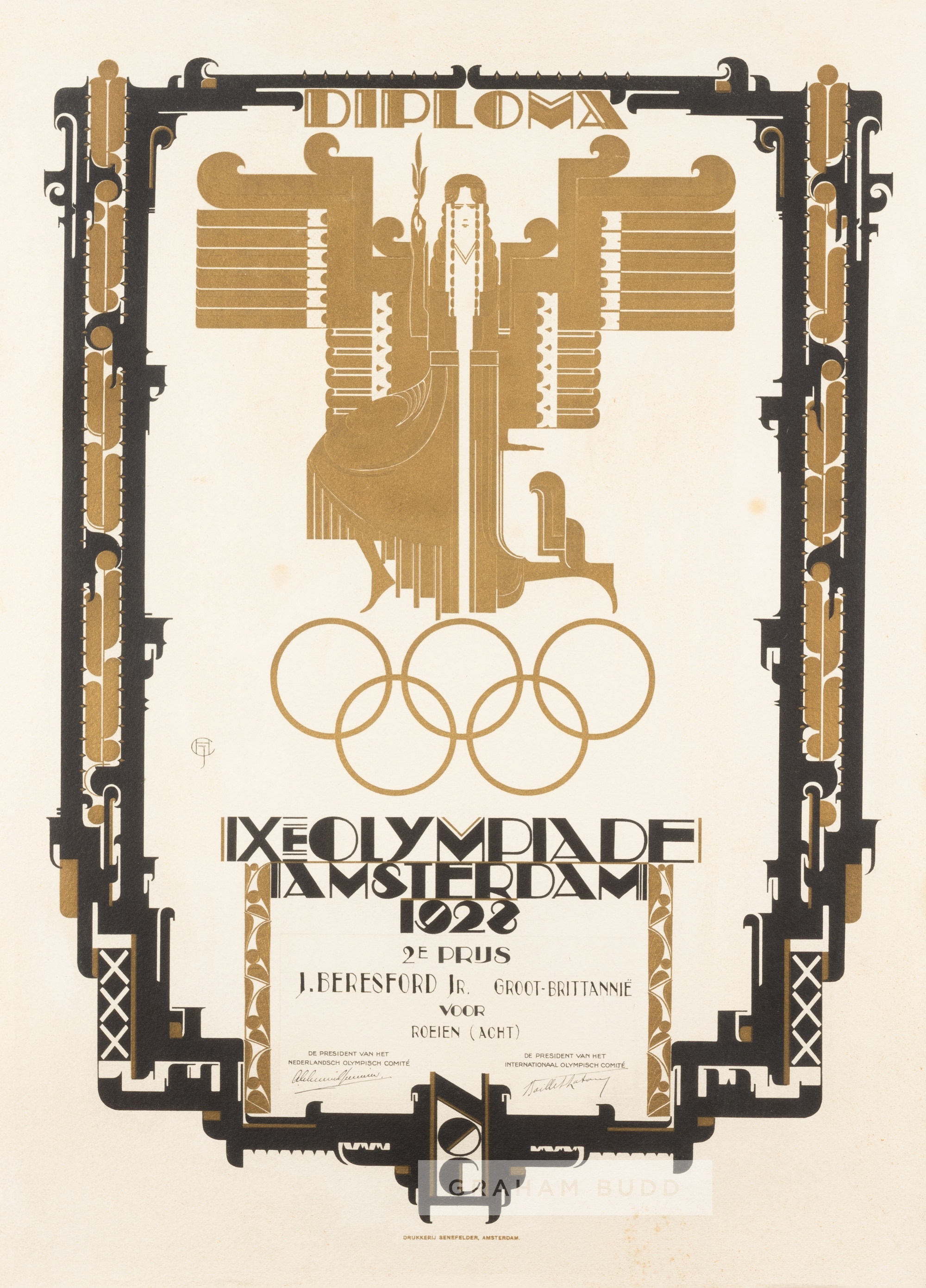 1928 Amsterdam Olympic Games eights rowing silver medal diploma awarded to Jack Beresford of Great Britain, featuring the Art Deco style winged Nike above Olympic rings with printed details, glazed and framed, 87 by 67cm. overall, frame bears minor wear, the diploma bears minor foxing Jack Beresford (1899-1977), British rower who won five medals at five Olympic Games in succession representing Great Britain. He won Singles Sculls silver medal in 1920 Antwerp games; Singles Sculls gold medal in 1924 Paris games; Eights silver medal in 1928 Amsterdam games; Coxless fours gold medal in 1932 Los Angeles games and Double Sculls gold medal in 1936 Berlin games. Please be aware all glass will be removed from framed and glazed items prior to posting and may result in delays to shipping your items. (This service is included in the cost of postage and packing). We can also totally remove all framing and mounts upon request to reduce shipping costs. Alternatively lots can be collected in person by prior appointment from NN8 1RT.