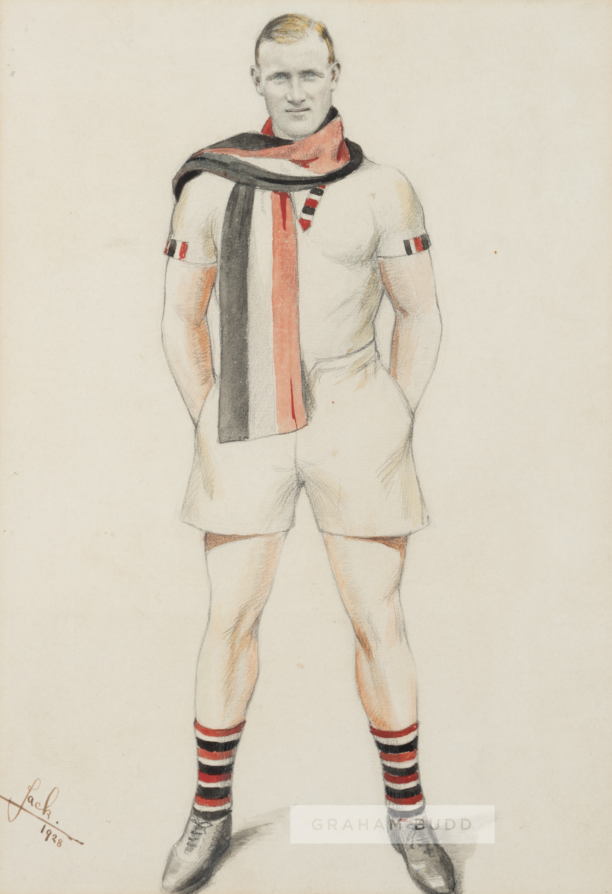 A portrait of Great Britain's Olympic gold medallist and Thames Rowing Club Jack Beresford, circa 1928, depicting Jack Beresford standing wearing the Thames Rowing Club kit, with the club colours of red, white and black, bearing the title in black ink lower left corner JACK 1928, unsigned by artist, mounted, framed and glazed, reverse of frame inscribed JACK BERESFORD GOLD MEDALLIST OLYMPIC SCULLER, 50 by 37cm. overall, minor wear to frame Jack Beresford (1899-1977), British rower who won five medals at five Olympic Games in succession representing Great Britain. He won Singles Sculls silver medal in 1920 Antwerp games; Singles Sculls gold medal in 1924 Paris games; Eights silver medal in 1928 Amsterdam games; Coxless fours gold medal in 1932 Los Angeles games and Double Sculls gold medal in 1936 Berlin games. Please be aware all glass will be removed from framed and glazed items prior to posting and may result in delays to shipping your items. (This service is included in the cost of postage and packing). We can also totally remove all framing and mounts upon request to reduce shipping costs. Alternatively lots can be collected in person by prior appointment from NN8 1RT.