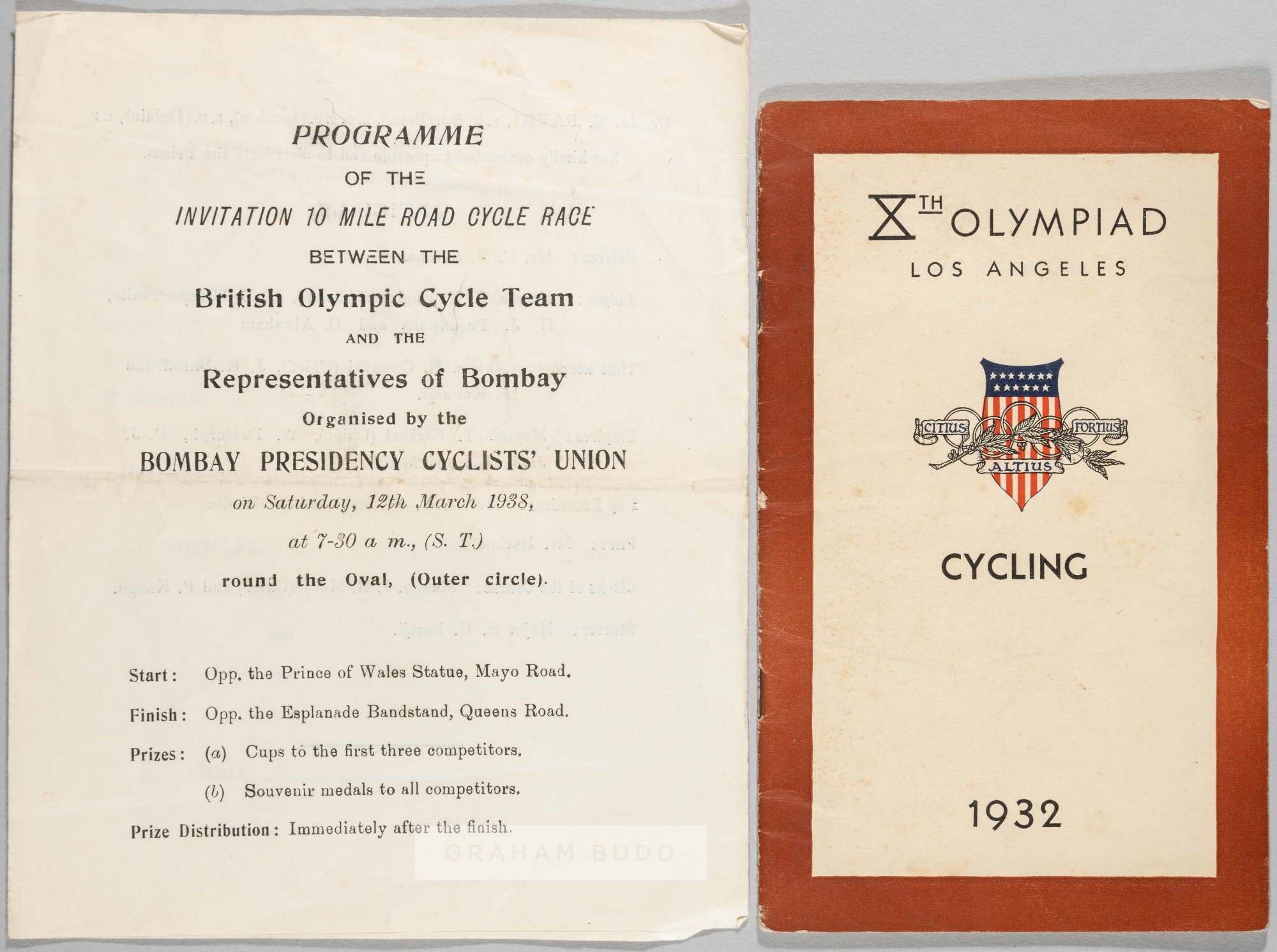 Los Angeles 1932 Olympic Games General Rules & Regulations for Cycling programme, 24-page programme with illustrated cover, featuring the general rules and regulations, cover bears slight wear to page edges and spine, slight creasing of cover, sold with a programme for the invitation 10 mile road cycle race between British Olympic Cycle Team and Representatives of Bombay, held in Bombay, 12th March 1938, four-page paper programme, printed in black lettering, features names of officials and competitors with no.1 EV Mills written in pencil, bears wear and folds throughout, (2) This is the only link with the Olympic Games, EV Mills took part in the 1936 Road race, he came third in the British Empire Games in Sydney on the 5th and 12th February. The team could have stopped off at Bombay on the way home from the Commonwealth Games.