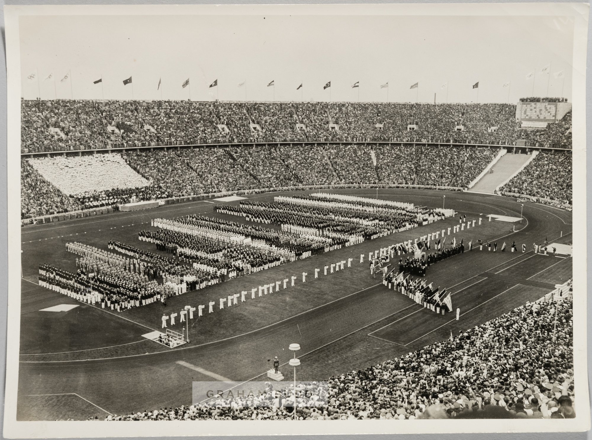 OLYMPIC GAMES 1936 THE OPENING CEREMONY AT THE OLYMPIC STADIUM BERLIN ORIGINAL PRESS PHOTOGRAPH RARE ORIGINAL BLACK & WHITE 9 ½” x 7” PHOTOGRAPH PUBLISHED BY PRESSE-BILD ZENTRALE, BERLIN, FROM THE OLYMPIC GAMES 1936, OLYMPIC STADIUM, BERLIN, GERMANY, 1ST AUGUST, 1936. THE IMAGE DEPICTING THE VAST 100,000 CROWD WATCHING THE OPENING CEREMONY AT THE POINT THAT ALL PARTICIPATING ATHLETES HAD PARADED ONTO THE CENTRAL PLAYING SURFACE. PRESSE BILD ZENTRALE, BERLIN STAMPED ACCREDITATION. The 1936 Summer Olympics (German: Olympische Sommerspiele 1936), officially known as the Games of the XI Olympiad, was an internatonal multi-sport event held in 1936 in Berlin, in Nazi Germany. To outdo the Los Angeles games of 1932, Reich Chancellor Adolf Hitler had a new 100,000-seat track and field stadium built, as well as six gymnasiums and many other smaller arenas. The games were the first to be televised, and radio broadcasts reached 41 countries. Filmmaker Leni Riefenstahl was commissioned by the German Olympic Committee to film the Games for $7 million. Her film, titled Olympia, pioneered many of the techniques now common in the filming of sports. The Opening ceremony took place on the 1st August, 1936 at The Olympic Stadium, Berlin, Germany.