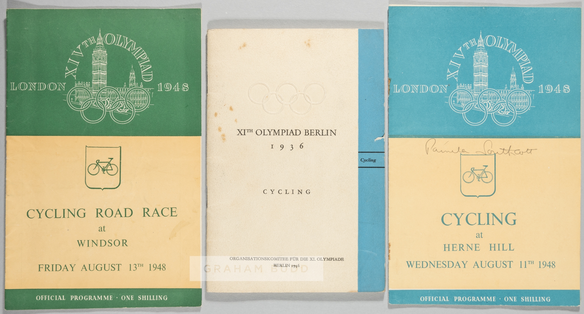 Berlin 1936 Olympic Games Cycling general rules and regulations booklet, 38-page with cover embossed with the Olympic rings, featuring general rules and regulations with programme of Olympic events, bears minor foxing to cover, together with two 1948 London Olympic Games Cycling programmes, comprising Cycling at Herne Hill, Wednesday 11th August 1948, 12-page with cover, featuring events, competitors names, track layout, some pencil annotations and Cycling Road Race at Windsor, Friday 13th August 1948, eight-page with cover, featuring map, entrants, score sheet, previous winners, each bearing minor wear, (3) The front cover of each programme bears the name of Pamela Southcott in pencil, she was the wife of EJ Southcott, President of the National Cyclists Union.