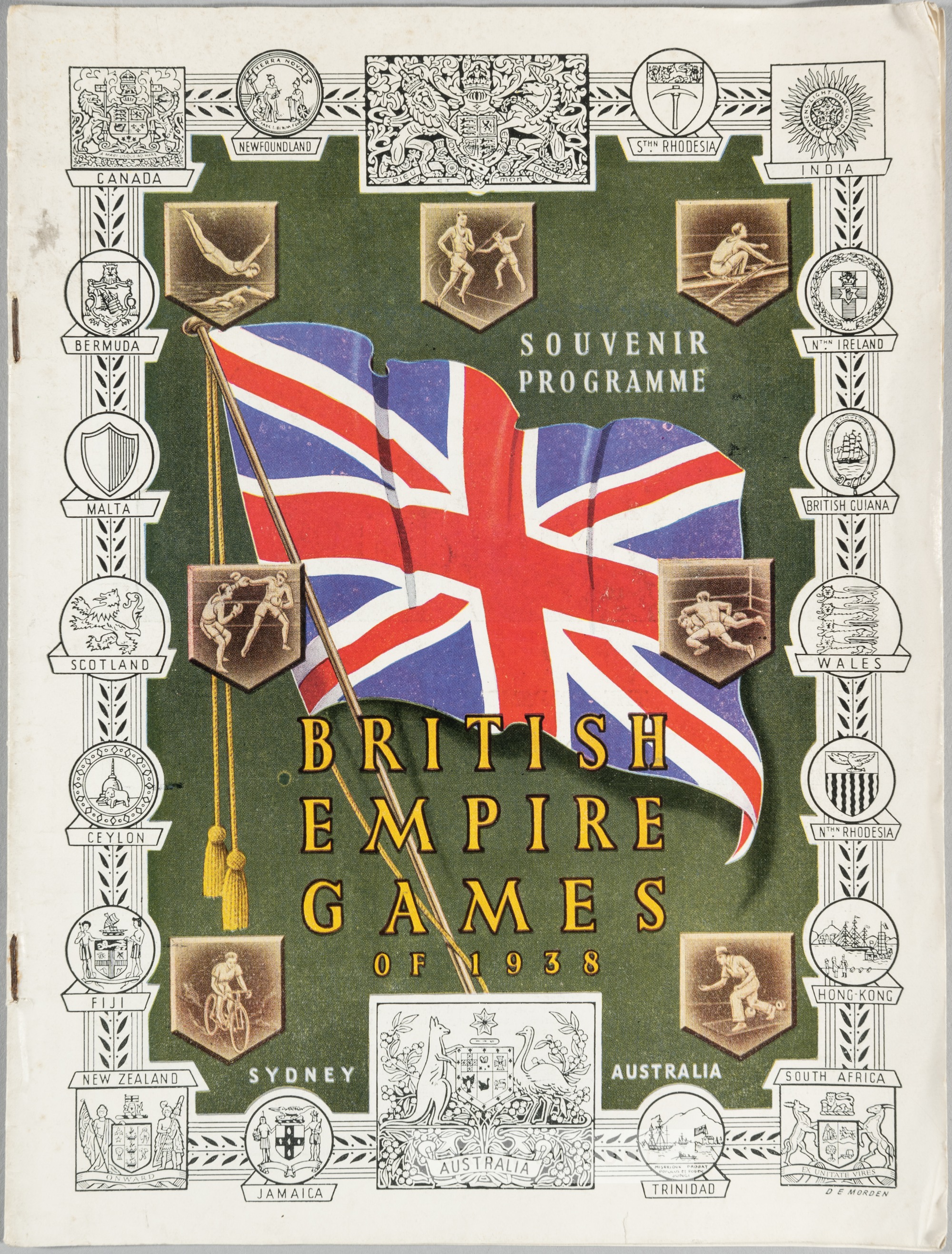 British Empire Games official souvenir programme, held in Sydney on 5th to 12th February 1938, 32-page programme with illustrated cover bearing the British flag surrounded by the competing countries, the back cover featuring Don Bradman with a Peters ice cream, containing details of the opening ceremony, events, summary of competing teams, records, closing ceremony with images of visiting teams, bears wear and pencil annotations It was part of Australia's 150th anniversary, 464 athletics took part in 71 events from 15 nations.